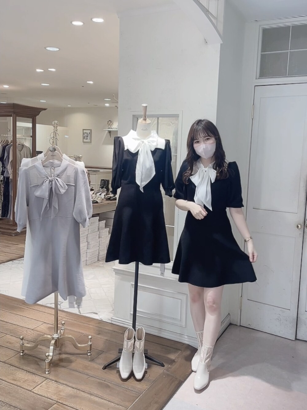 こちらのワンピースは、フロントの大きめリボンが可愛い♡もちっとした柔らかいお素材なので、着心地も抜群です◎フレアシルエットなのでお尻周りをカバーしてくれます❤︎シアー感のあるショートブーツと合わせて、足元は抜け感が出るようにしました♪