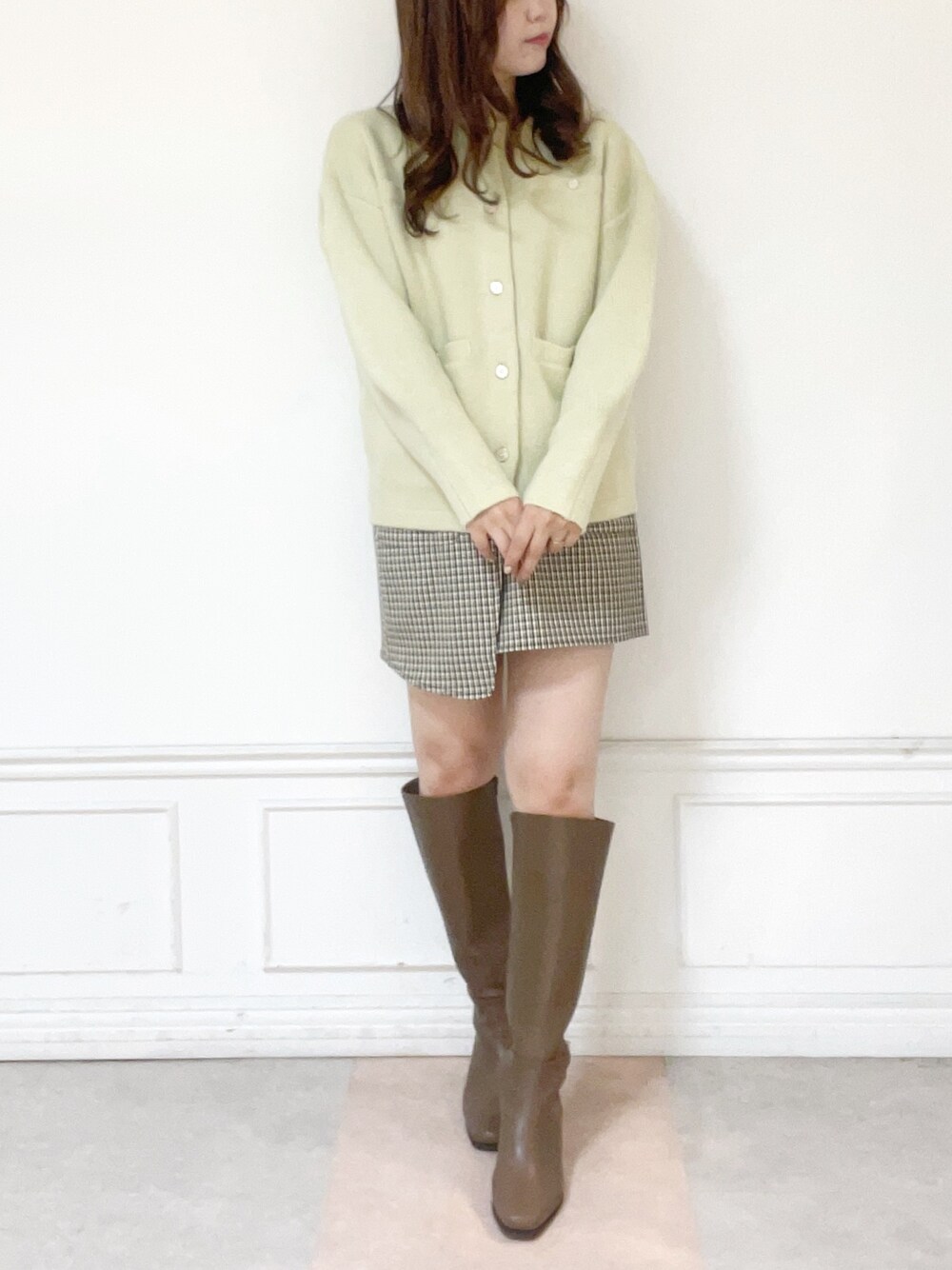 もちっとしたお素材が着心地抜群のカーディガンと、ミニスカートを合わせたトレンドコーデ♪柔らかいカラーでまとめたコーデにしました。