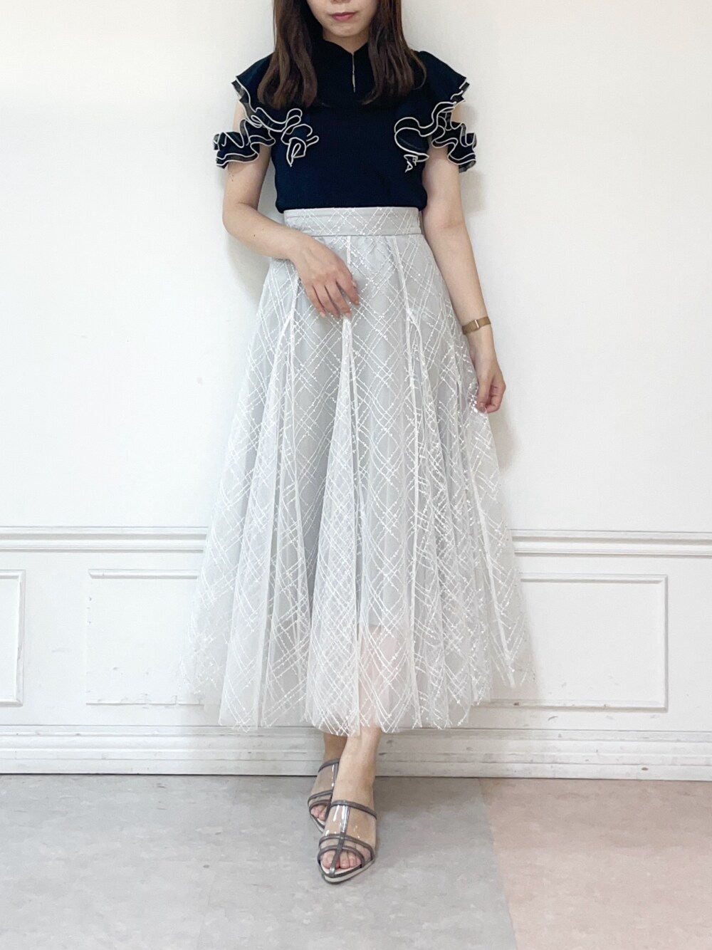 こちらのトップスはカットソーなので、夏場も着て頂きやすいさらっとしたお素材です♪お袖のフリルが二の腕カバーもしてくれます◎スパンコールスカートと合わせることで華やかなコーデに♡