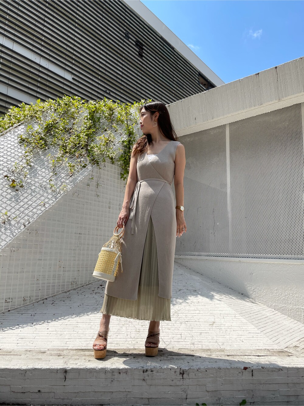 \\着回しもできちゃうすっきり見えワンピ// Iラインのシルエットですっきりとした見え感のワンピースは、リブニットのラップワンピとプリーツスカートのセットなので中のスカートをレースタイトやワイドパンツにしたり、プリーツスカートはTシャツ合わせでカジュアルに着たりと着回し力抜群! スカートはウエストゴムで好きな丈感にできるので小柄な方~高身長さんまで身長問わず着用できるのも嬉しいポイント♡ また、前後2wayで着用可能なのでトレンドのバックシャンデザインにも◎ 肌なじみの良い淡いミントカラーは小物もクリア系で揃えれば気温の高い日でもでも爽やかな印象で着用できます☺︎
