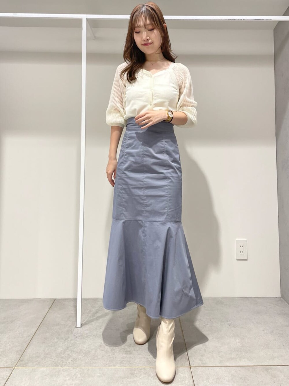 ホワイト×ブルーで清潔感◎のコーディネート♬ カーディガンは前後2wayで着用できます☻肩の透け感が一気にコーディネートを爽やかな印象にしてくれます♡スカートはさらっとしたタフタ素材で夏でも着れる素材感◎付属でリボンも着くので巻いていただくと雰囲気もガラッと変わります!