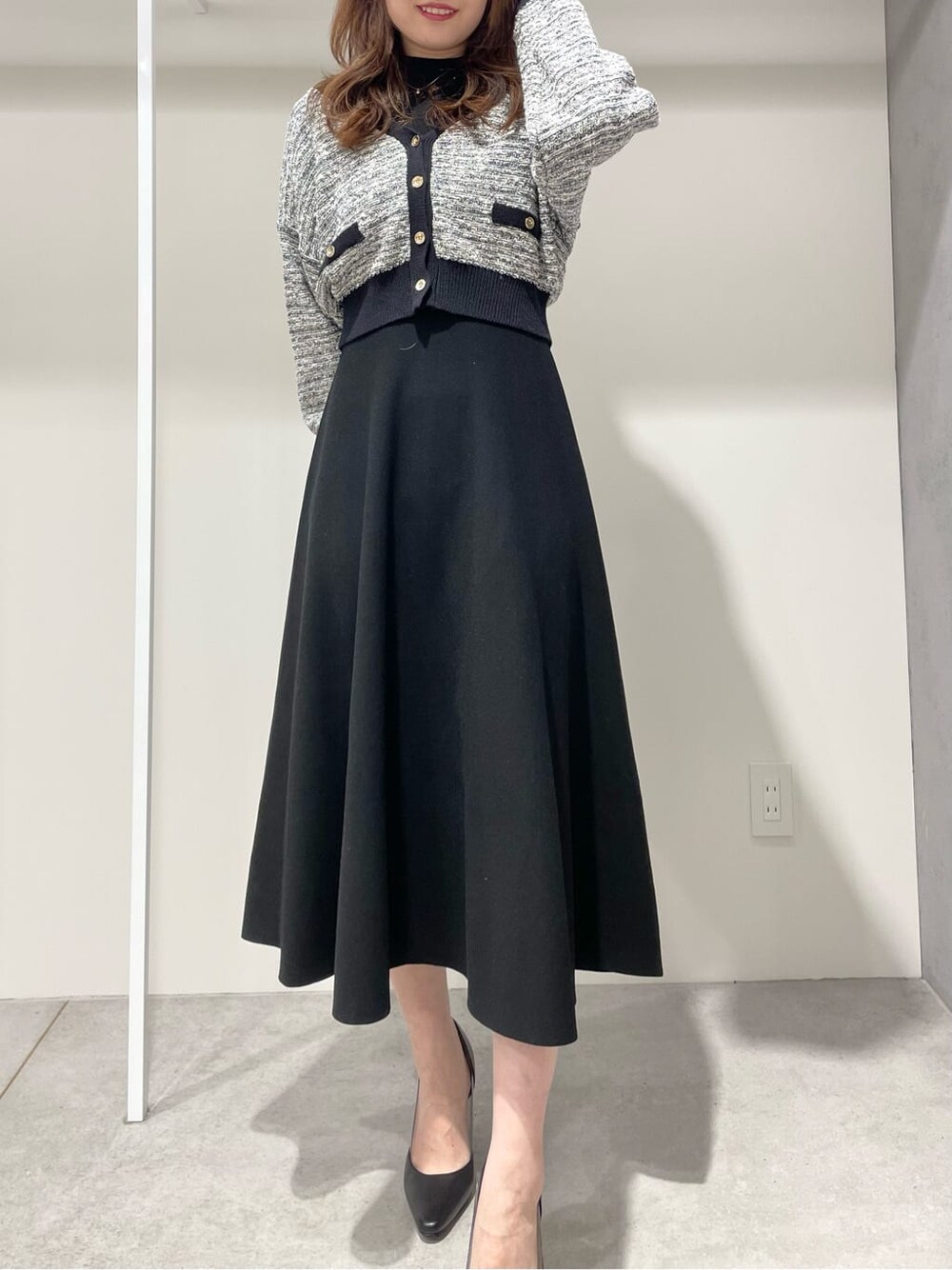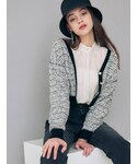 シンプルなハイネックワンピースにトレンドのツイードカーディガンを合わせて高級感のあるコーディネートに♡カーディガンだとツイードジャケットよりもゆったりめのシルエットで普段使いもしやすいですよ♬ ワンピースはシンプルだからこそスカーフやベルトで自分好みに着こなせるアイテムです♡
