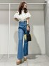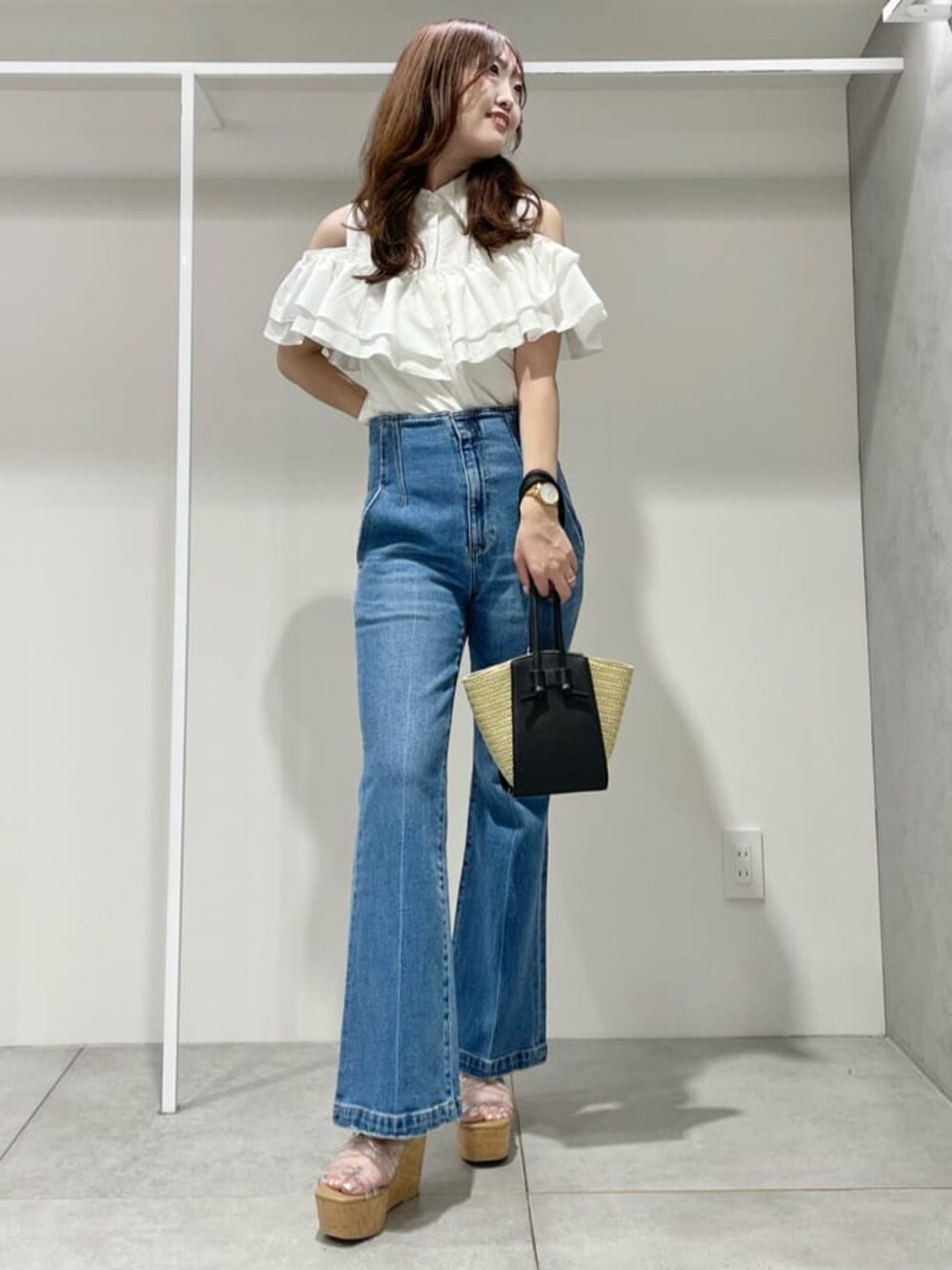 カチッとしがちなホワイトシャツもラッフルスリーブ、オープンショルダーで抜け感を¨̮ボリュームたっぷりのラッフルで顔周りも華やかに、気になる二の腕のラインも自然にカバーしてくれます♡トップスにボリュームがあるのでボトムスはスッキリとしたフレアデニムでバランスよく♬ ハイウエストでスタイルアップ効果抜群な上にストレッチも効いていてストレスフリーな履き心地◎やっと再入荷したMERCURYDUOの神サンダルはしっかりクッション、緩やかな傾斜で長時間履いても疲れづらいです¨̮23.5cmで36がぴったりのサイズ感でした♡バッグの色はブラックを選んでコーディネートを引き締めています◎