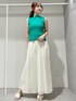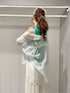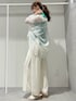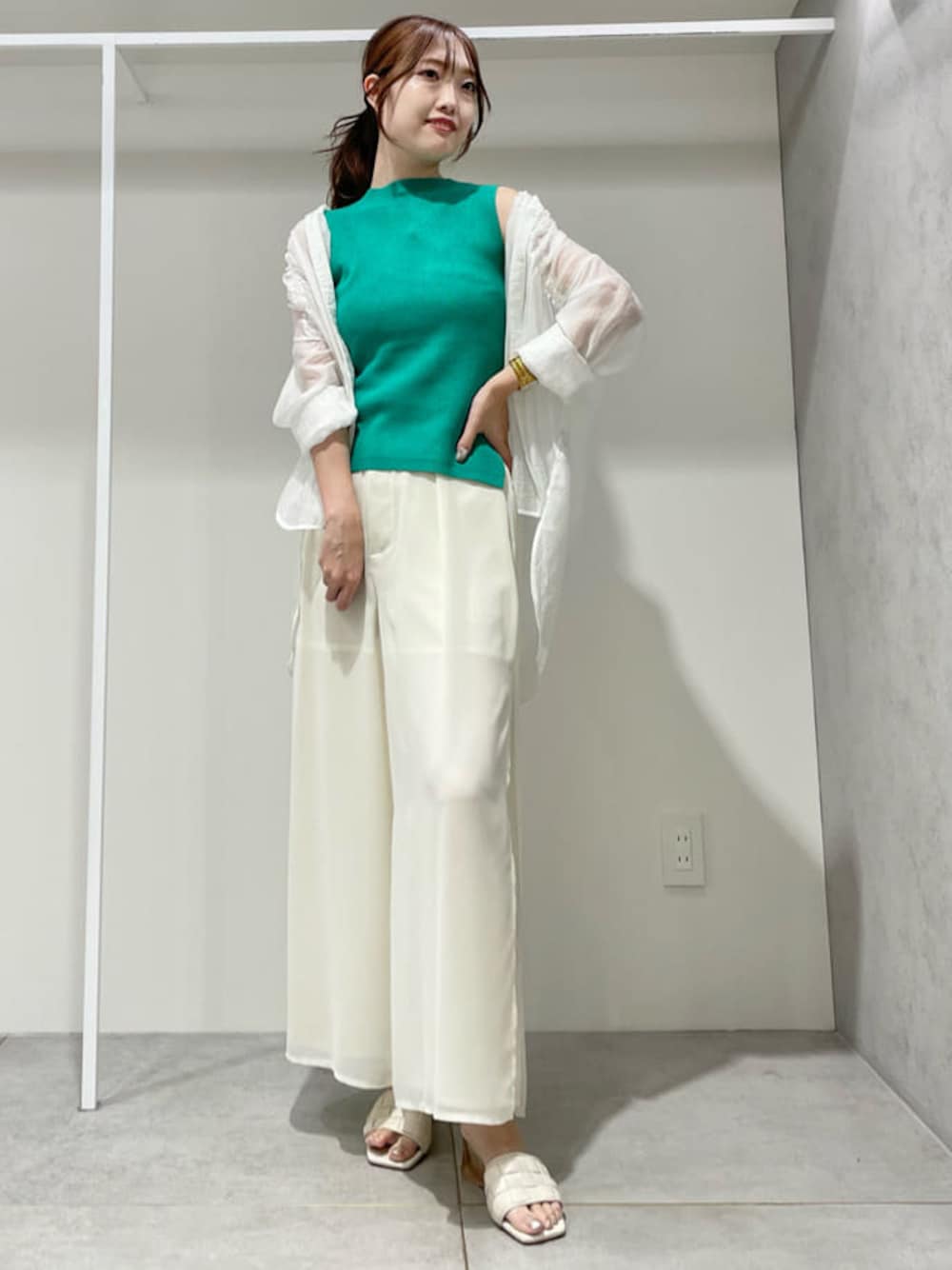 サラッとした少し肉厚な片畦ニットはサイドスリットが入って前後差があるので程よく腰周りをカバー♡ ワイドパンツはポリエステル100で夏でもサラッと着られる素材感¨̮大胆なサイドスリット、シアー感で一気におしゃれな雰囲気に♡ニット×パンツだとシンプルすぎるのでオーバーサイズのシアーシャツを合わせてトレンド感を足してみました¨̮ニット以外はホワイトで統一した鮮やかなグリーンニットが主役のコーディネートです♬