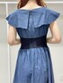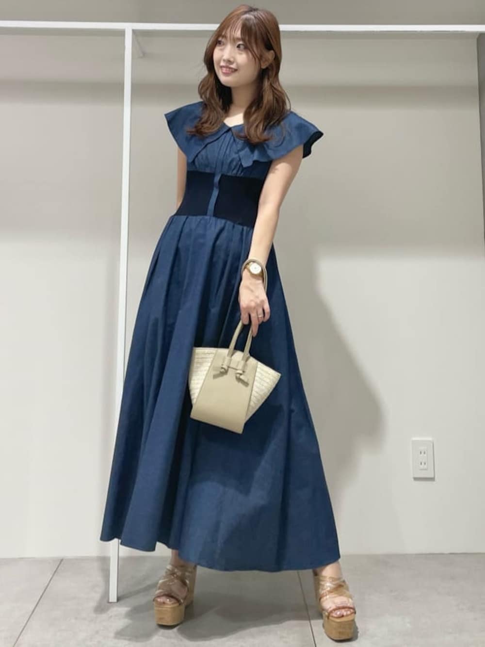 ビッグカラーがトレンドライクなワンピース¨̮インディゴカラーはコットン100なので通気性も抜群!暑い日もさらっと着用できます¨̮フリーサイズで普段のMERCURYDUOのワンピースに比べ少しゆったりめのサイズ感ですがウエストリブが程よくフィットしてくれてスッキリ見せてくれます♡後ろファスナーで着脱が楽なのも嬉しいポイント♬ 165cmで足首見えるくらいの丈感なので高めのヒールで合わせるとバランス◎ヒール高めなのに傾斜がゆるくて安定感抜群のMERCURYDUOの神サンダル合わせがおすすめ♡