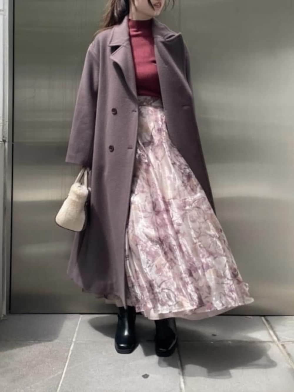 \\花柄でも甘くなりすぎない♡大人フェミニンコーデ// 華やかな花柄が目を引くスカートは、ひっくり返すと無地スカートにもなるリバーシブルデザイン ♡ふわっとボリューミーに広がるシルエットが今年らしい印象に¨̮トップスはコンパクトなリブニットで合わせてすっきりと。柔らかくチクチクしないのでストレスフリーな着心地です¨̮カラーをスカートの色味と合わせればカラー×カラーでも上品にまとまります♡定番のチェスターコートは今年は丈感長めのお作り¨̮165cmMサイズ着用で足首上5cmほど。ウール85%とは思えない軽い着心地です♡