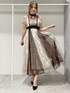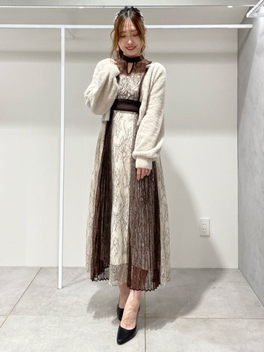 \\大人配色ドレスコーデ//ブロッキングデザインが目を引くドレスはプリーツ切替で動く度にふわっと揺れるデザイン♡ハイネックなのでネックレスがなくても華やかです¨̮165cmMサイズで足首かかるくらいの丈感ですが裏地が短めなのですっきり見せてくれます♡MERCURYDUO定番の洗えるシャギーカーディガンを合わせれば冷え込む朝晩も安心♫ブラウンの色味で合わせたのでイヤリングもゴールドで統一感を出しました¨̮