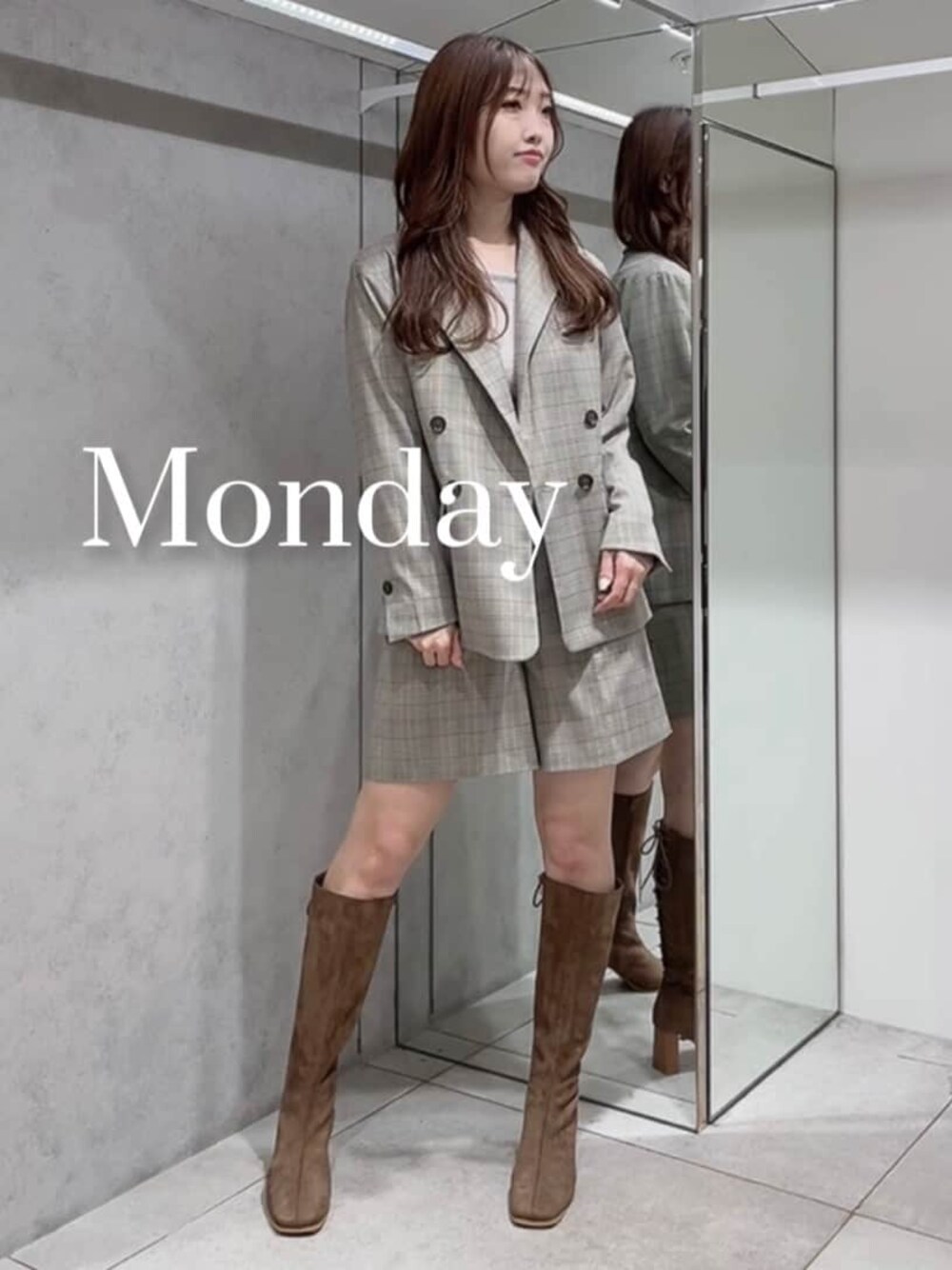 【Monday coordinate】秋になると着たくなるセットアップ。着用カラーのミックスはブラウンベージュ系の色味で女性らしい印象♡ ジャケットが少しオーバーサイズなのでニット合わせでも肩周りがすっきり¨̮ショートパンツはハイウエストで脚長効果抜群!165cmでSサイズ着用。少し長めの丈感で挑戦しやすくなっています◎インナーに着たシャギーニットは洗濯可!ふわふわの肌触りで着心地抜群♡ロングブーツはブラウンで合わせて大人フェミニンな雰囲気に仕上げました♡23.5cmで36のサイズがぴったりです!Instagramで1週間コーデリール投稿してます¨̮