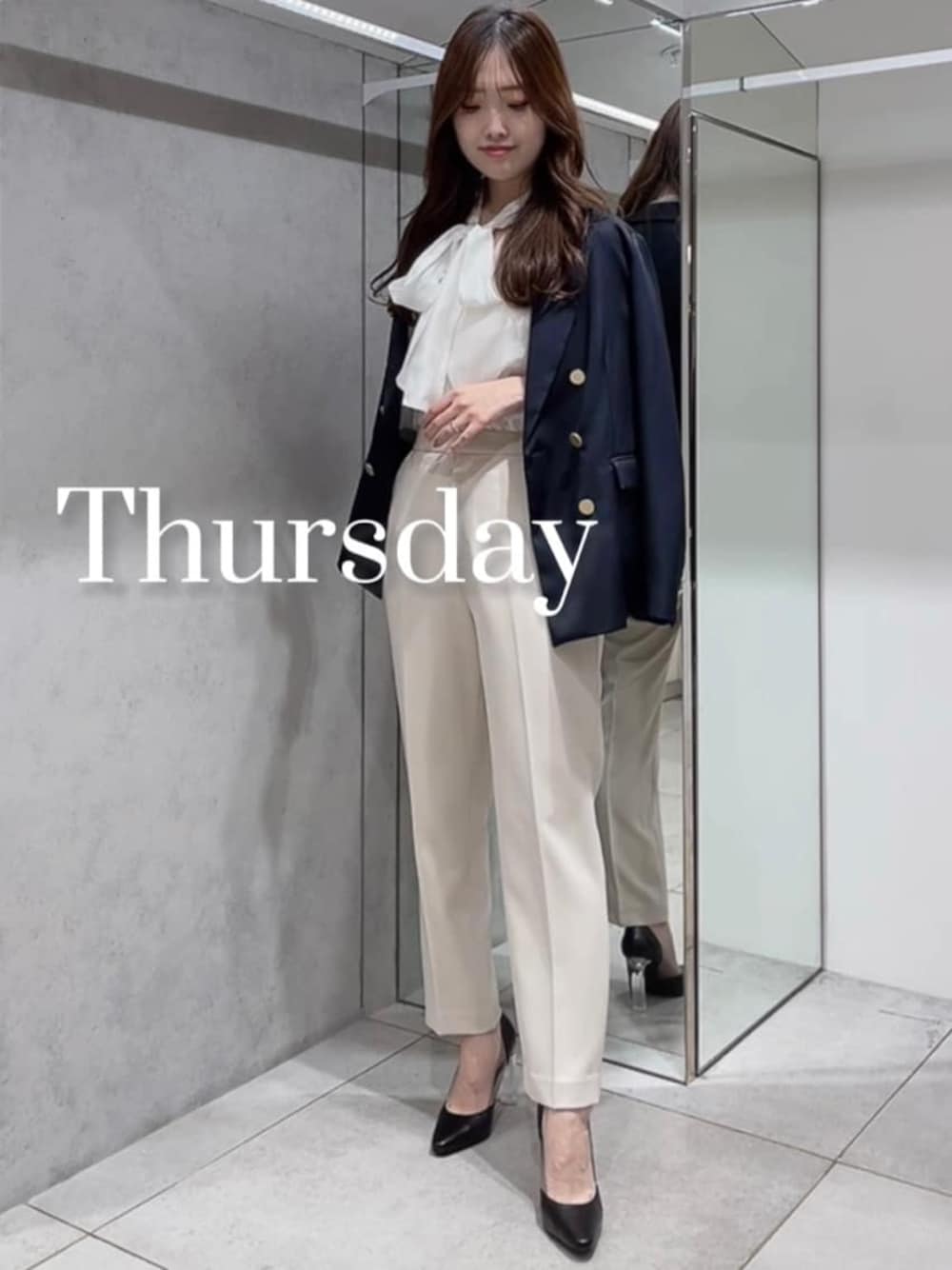 【Thursday coordinate】ネイビー×ゴールドボタンがトレンド感◎のジャケットは少しオーバーサイズのお作り¨̮カチッとしすぎないのでどんなコーディネートにもさらっと合わせやすくなってます◎165cmMサイズでヒップ隠れるくらいの丈感です!アウターがシックなカラーなのでインナーは明るめの配色に。シャツは前後2way、とろみのある素材感¨̮テーパードパンツはお仕事にもOKのベーシックデザイン!腰にはゴムも入っていて着心地も◎Mサイズ着用で足首かかるくらいの丈感です!Instagramで1週間コーデリール投稿してます¨̮