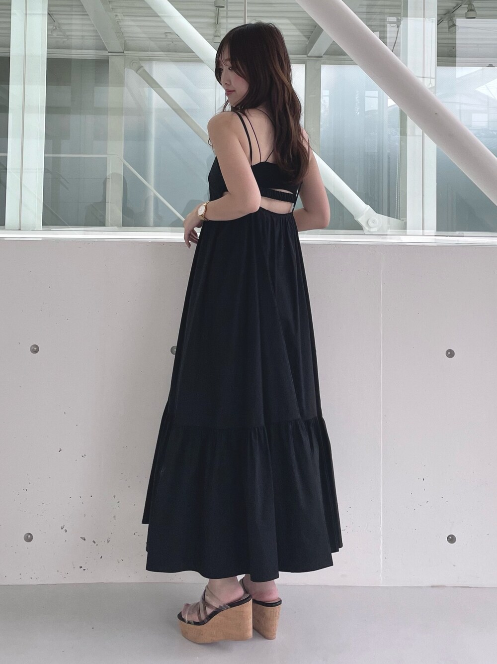 \\バックシャンデザインが目を引く夏の主役ワンピース// 大胆に開いた背面が特徴のワンピース🫧胸下から広がるティアードシルエットでストレスフリーの着心地🫶裏地も綿が入るので通気性◎で夏にたくさん着たい素材感です😊同色のカップ付きインナーを合わせるのがおすすめですが、肌見せ感を抑えたければシアートップスを中に着たり、ボレロを合わせるのもおすすめです😊 合わせたサンダルは毎年大人気の神サンダル🫧ウエッジソールで傾斜が緩やかなので楽ちんな履き心地、驚くほど軽くて長時間履いていても疲れづらいです☺️新色のブラックは幅広いスタイリングに合わせやすい万能カラー🖤23.5cmで36サイズがぴったりです!