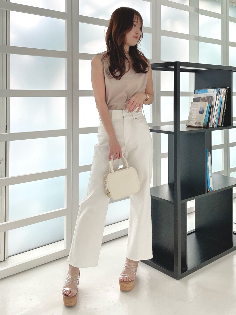 \\淡色合わせでカジュアルフェミニンコーデ// Championとの別注アイテムのノースリTシャツは少しゆるっとした身頃で華奢見え❤️立体感のある厚盛のラバープリントの筆記体ロゴもポイントです☺️コンパクトなサイズ感でフェミニン派さんも挑戦しやすいシルエットになってます❤️ホワイトデニムで合わせてカジュアルすぎないコーディネートにするのがおすすめです✌️