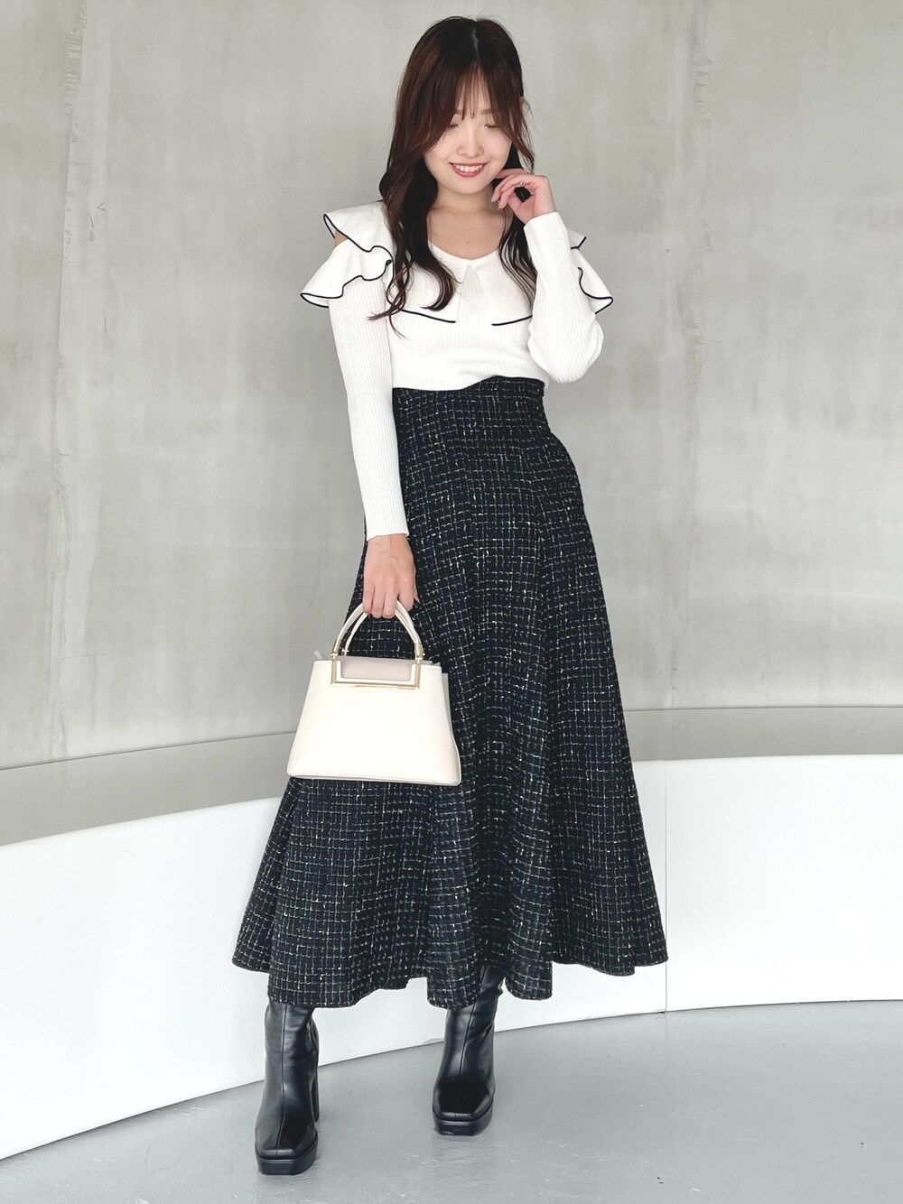 \\ツイード素材で秋冬モノトーンコーデ// 【トップス】 去年も大人気だった肩あきニット⸜❤︎⸝今年はパイピングデザインがトレンド感◎でおすすめです😊ベーシックなカラーで着回し力も抜群のアイテム! 【スカート】 腰にレースアップが付いていてコルセットのようにウエストをぎゅっと調整可能!しっかり地厚のツイード素材で真冬まで暖かく着用できます❤️165cmMサイズで足首上3cm程の丈感でした! 【バッグ】 シンプルなデザインにメタルのポイントが入った高級感のあるバッグ🫧ショルダーも付属しているので肩掛けにも出来る仕様です!中の仕切りになっているファスナー付きの部分は取り外し可能で間口を広く使うことも出来ます🫶 【シューズ】 脚長効果抜群のプラットフォームブーツは前に厚みがあるので傾斜が緩やかで約10cmヒールとは思えないほど楽な履き心地です🫶23.5cmで36サイズがぴったりでした!