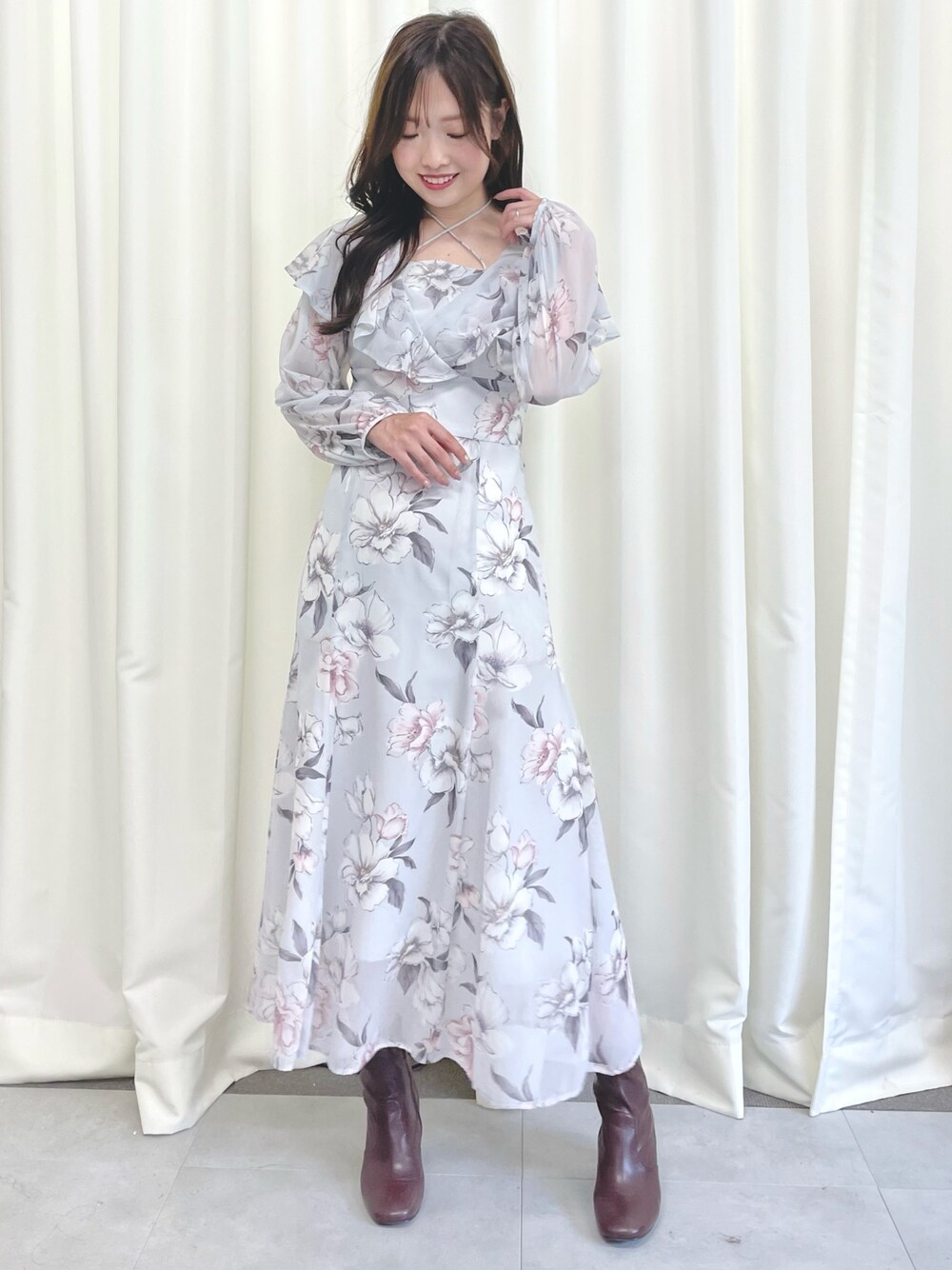仲田桃子(MERCURYDUO)のワンピース「BIGフラワーラッフルカシュクールワンピース」を使ったコーディネート