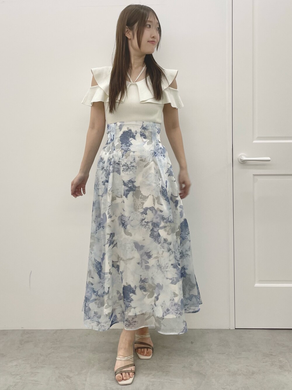 \\夏のおでかけに🫧爽やかブルーコーデ// 【トップス】 デコルテ周りが綺麗に見えるストラップ付きのニット⸜❤︎⸝二の腕がちらっと見える抜け感のあるデザインです!ストラップは取り外しも可能なのでシンプルに使うこともできます! 【スカート】 淡い水彩タッチの花柄が大人上品なスカート🫧少しハリ感のあるシアー素材でフレアのシルエットが綺麗に出るデザインです!腰位置シャーリングゴムでウエストラインはすっきり見せてくれます😊ポケット付きなのもこの時期嬉しいポイント♡165cmMサイズで足首がしっかり見えるくらいの丈感でした! 【シューズ】 華奢なクリアストラップと内側のメタルヒールがポイントのサンダルはどんな系統のコーデとも合わせやすい万能アイテム!23.5cmで36サイズがぴったりでした!
