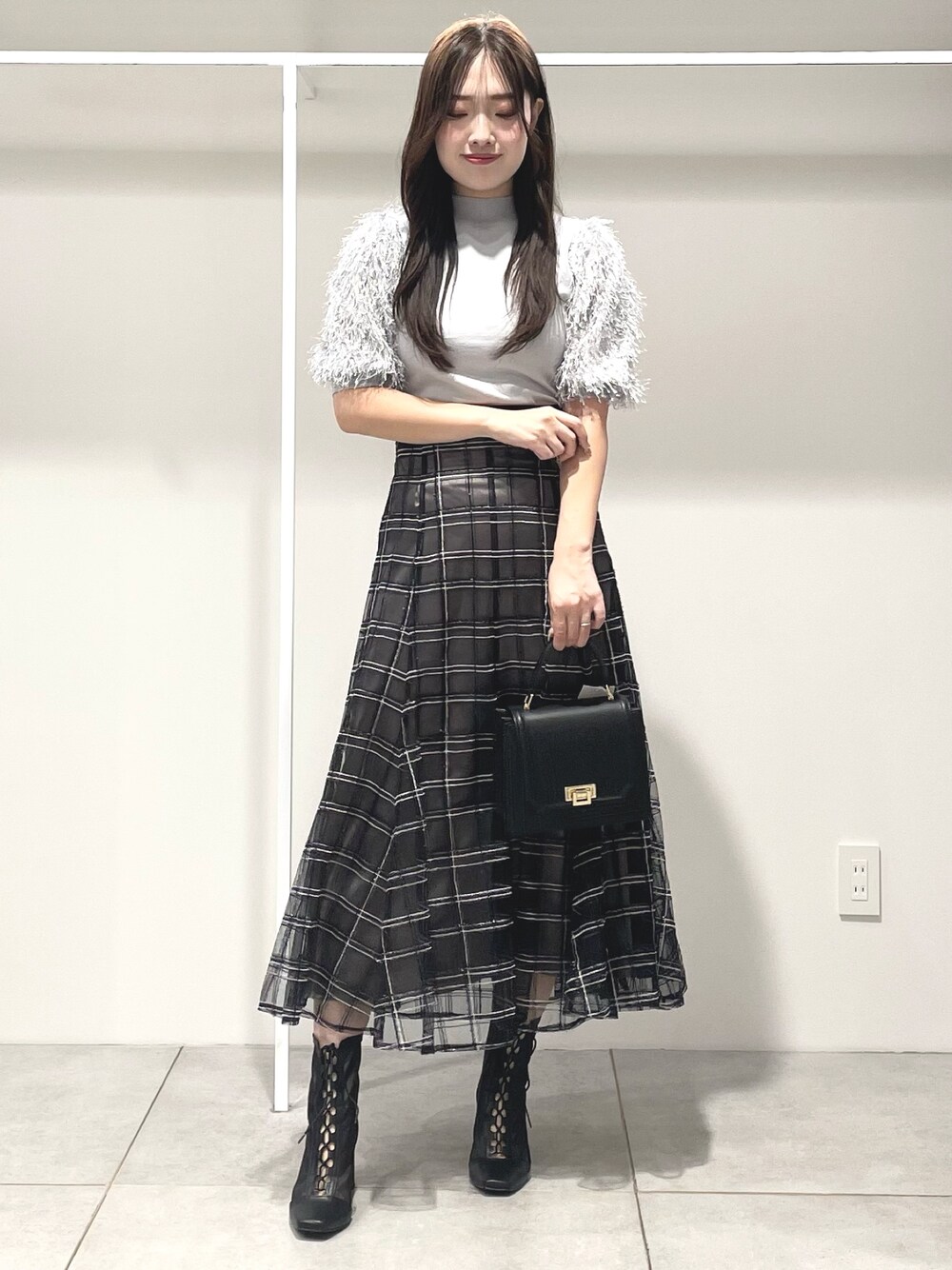 \\晩夏から着られる🫧涼しげ秋コーデ// 【ニット】 フェザースリーブがシーズン感◎なニットはさらっと薄手の生地感なので残暑の時期から長く着用できます🫶ボトムにインしやすい少し長めの丈感です。 【スカート】 スパンコールが織り込まれていて動く度にきらっと光る上品なスカート🫧腰周りはコンパクトなのでフレアスカートでも着太りせずすっきりしたシルエット😊腰に太めのシャーリングゴムが入っているので着心地も◎です!165cmMサイズで足首上3cm程の丈感でした! 【バッグ】 かちっとした印象のスクエアバッグはアコーディオン型で中にも仕切りがたくさんあり荷物がすっきりまとまります☺️ ショルダーにもなる2way仕様です! 【シューズ】 シアーのショートブーツは晩夏に大活躍!レースアップデザインで足元がすらっとみえます😊23.5cmで36サイズがぴったりでした!