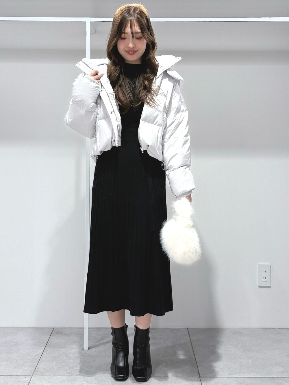 \\真冬もok⸜❄️⸝モノトーンコーデ// 【アウター】 毎年大人気のダウンコートは高品質ダウン70%フェザー30%の軽くて暖かいお作り😊襟が大きく開くのですっきりとした見え感、裾はドロストで絞ってシルエットを変えられるようになっています!フードはファスナーで取り外し可能です!165cmSサイズで腰にかかるくらいの丈感、袖の長さはジャストでした! 【ワンピース】 MERCURYDUOの代名詞だった異素材ワンピースがデザイン新たに新登場!オフショルブラウスをドッキングしたような華やかなデザインです☺️165cmMサイズで足首上15cm程の丈感でした! 【バッグ】 コロンとした形が可愛らしいファーバッグはチェーンも付いているのでハンドバッグ、ショルダーバッグと2wayで使用可能!取り入れるだけでシーズン感の出るおすすめのバッグです🐰💗 【シューズ】 ヒール部分のメタルがポイントのショートブーツ👢スクエアトゥでキレイめからカジュアルまで幅広いコーディネートに合わせやすくなっています😊23.5cmで36サイズがぴったりでした!