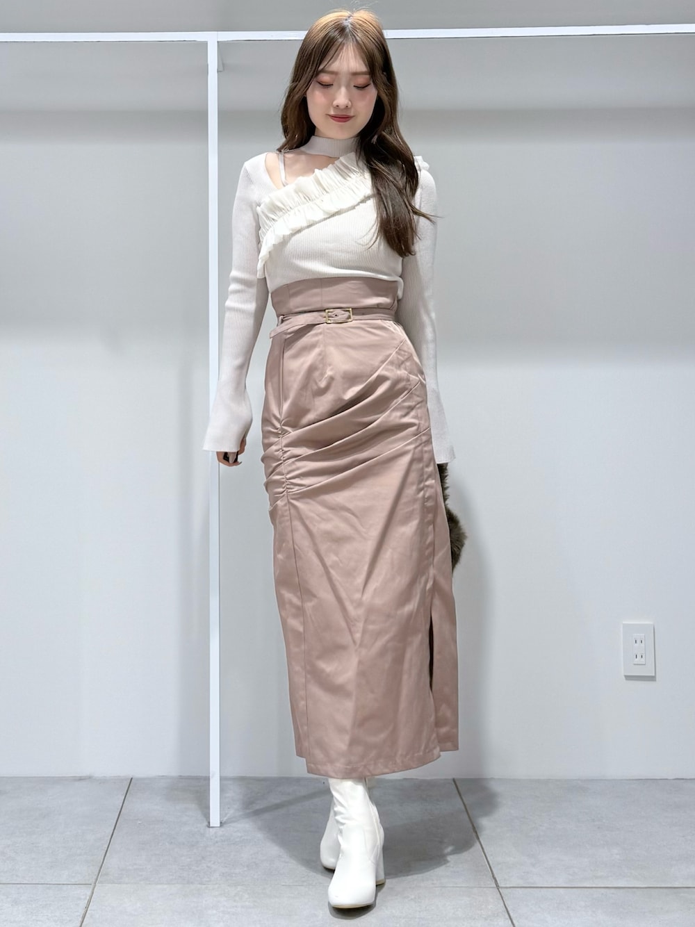 \\デートにおすすめ🤍淡色コーデ// 【トップス】 フリルが華やかなトップス🧶前後2way仕様でデコルテを開けずに着ることも可能!ほんのりベルスリーブで1枚で決まるニットです! 【スカート】 Iラインシルエットとサイドギャザーで脚長効果抜群のスカートは上品なくすみカラーもポイント🫧スリットはファスナーで調整可能です!165cmMサイズで足首上3cm程の丈感でした 【バッグ】 コロンとした形が可愛らしいファーバッグはチェーンも付いているのでハンドバッグ、ショルダーバッグと2wayで使用可能!取り入れるだけでシーズン感の出るおすすめのバッグです🐰💗 【シューズ】 柔らかいフェイクレザーのショートブーツは秋冬マストのアイテム🤍カラーによってヒールの柄が変わります☺️23.5cmで36サイズがぴったりでした!