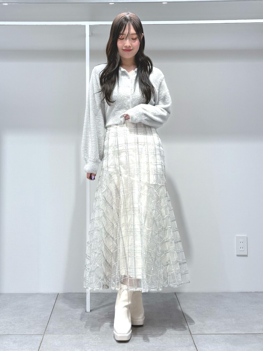 \\クリスマスに着たい🫧淡色コーデ// 【トップス】 毎年大人気のシャギーニットシリーズ🧶ふわっふわの肌触りでストレスフリー🫧短丈でアウトで着てもすっきりとした着丈です☺️ベーシックなカーディガンのシルエットなので前を閉めてトップスとしても、カーディガンとしても使える万能アイテム! 【スカート】 キラキラ光るラメ糸が織り込まれた動く度にきらっと光るスカート😊腰周りはフィット感があり太ももあたりから広がるマーメイドシルエットが華やかで上品✨バックレースアップでウエスト調整可能です📏165cmMサイズで足首上3cm程の丈感でした! 【シューズ】 サイドゴア×厚底で脚長効果抜群のショートブーツ👢前厚なので傾斜も緩やかで歩きやすいデザインです😊23.5cmで36サイズがぴったりです!