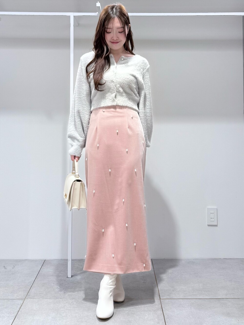 【トップス】 毎年大人気のシャギーニットシリーズ🧶ふわっふわの肌触りでストレスフリー🫧短丈でアウトで着てもすっきりとした着丈です☺️ベーシックなカーディガンのシルエットなので前を閉めてトップスとしても、カーディガンとしても使える万能アイテム! 【スカート】 冬に大活躍の温かみのあるベロアスカート🤍ドロップパールがトレンド感◎です🦪´- 165cmMサイズで足首が見えるくらいの丈感でした 【バッグ】 かちっとした印象のスクエアバッグはアコーディオン型で中にも仕切りがたくさんあり荷物がすっきりまとまります☺️ ショルダーにもなる2way仕様です! 【シューズ】 柔らかいフェイクレザーのショートブーツ🤍カラーによってヒールの柄が変わります☺️23.5cmで36サイズがぴったりでした