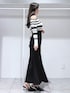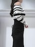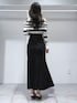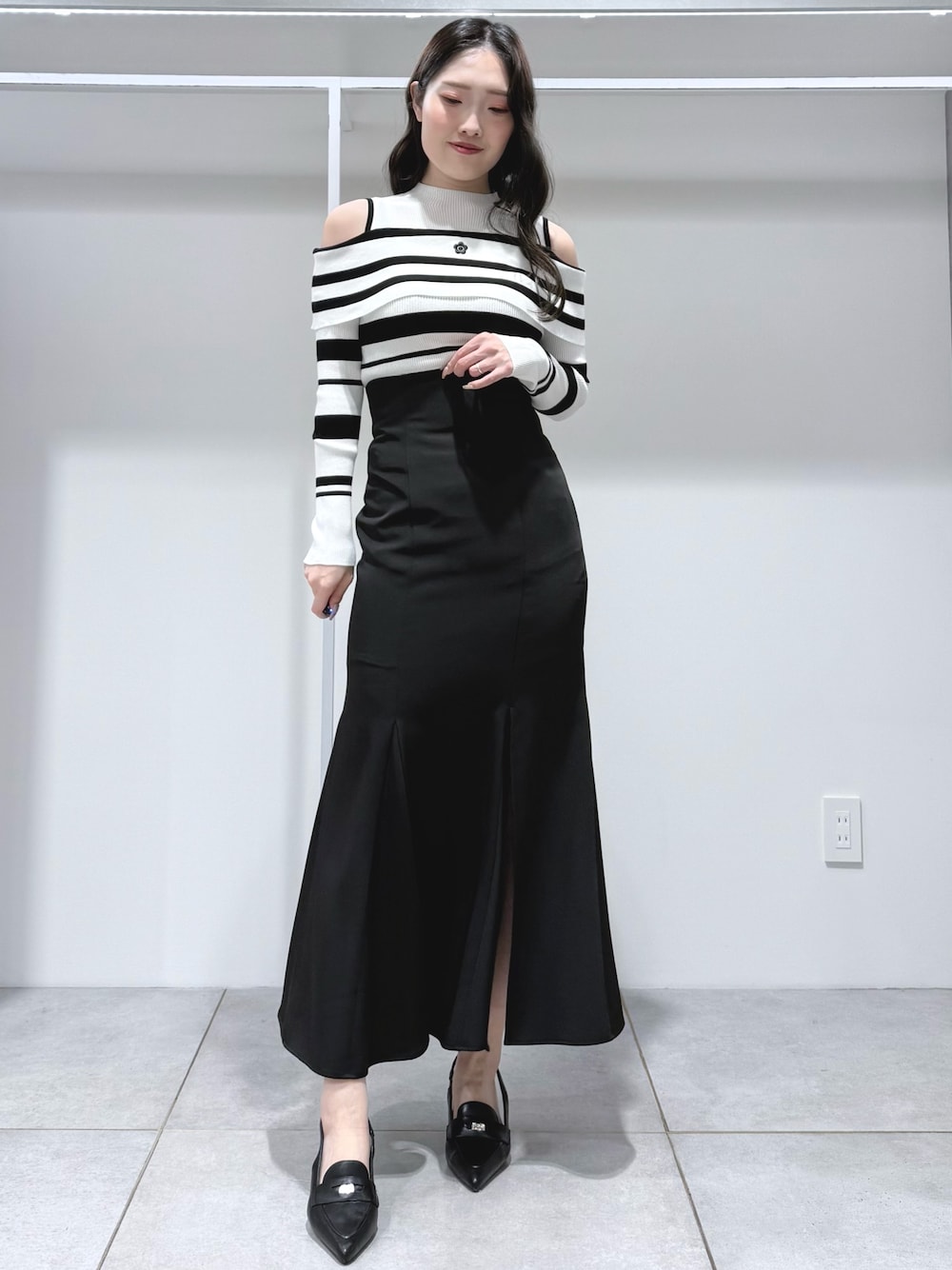 【トップス】 胸元のデイジー刺繍がポイントのニット🧶ランダムボーダーでおしゃれな見え観に✨肩あきなので長袖でも抜け感がでるニットです🫶 【スカート】 後ろがレースアップになっていてウエストサイズが調整可能♡程よくストレッチが効いていて身体のラインが綺麗に見えます🫶膝上位までのスリットも入っていて抜け感も◎165cmMサイズで足首上3cm程の丈感でした! 【シューズ】 春にぴったりのミュールはローファーデザインでトレンド感◎ポインテッドトゥなのでヒール低めでも脚がすらっと見えます☺️23.5cmで36サイズがぴったりでした✨