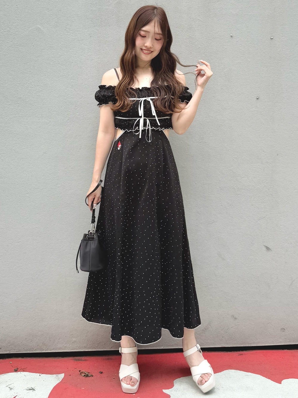 仲田桃子(MERCURYDUO)のワンピース「【メロクロコラボ】マイメロディシャーリングカットアウトワンピース」を使ったコーディネート