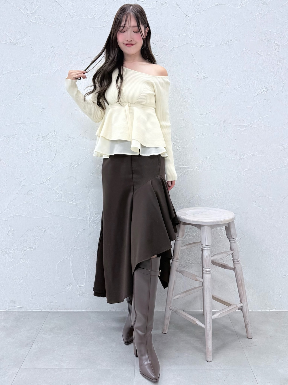 【ニット】 アシンメトリーな襟とペプラムデザインがシンプルながら華やかなトップス🫧ウエストマークがあるのでペプラムデザインでもすっきりと腰位置が高く見えるようになっています☺️ 【スカート】 アシンメトリーの裾がポイントのスカート🧸短い部分は膝が見えるくらいなのでロングブーツで合わせるかタイツをあわせるのがおすすめです! 【シューズ】 トレンドの筒太ブーツ👢形が崩れない硬めの合皮でシルエットが綺麗です✨ポインテッドトゥでキレイめスタイリングとも相性◎23.5cmで36サイズがぴったりでした!