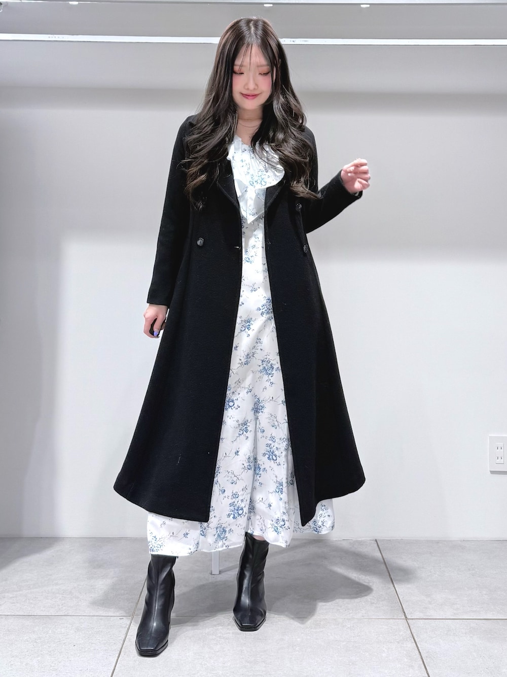 【アウター】 とにかくシルエットが綺麗なコート🥹 高めの位置でウエストがきゅっとくびれて見えて、ふわっと広がるフレアシルエットが華やか❤️軽いのにウール約90%配合でしっかり暖かいです🥰165cmSサイズで足首上15cm程の丈感でした! 【ワンピース】 胸元のフリルが華やかなワンピース👗繊細な花柄が大人っぽく上品な印象に♡胸下切り替えでウエストがスッキリと、脚もすらっと長く見せてくれます☺️肩がほんのり透けているのもポイントです🫧165cmMサイズで足首上5cm程の丈感でした! 【シューズ】 マーキュリーデュオ定番の柔らかいフェイクレザーのショートブーツ🤍今年はヒールがホログラムになっていてコーディネートのポイントに☺️23.5cmで36サイズが少しゆとりのあるサイズ感でした!