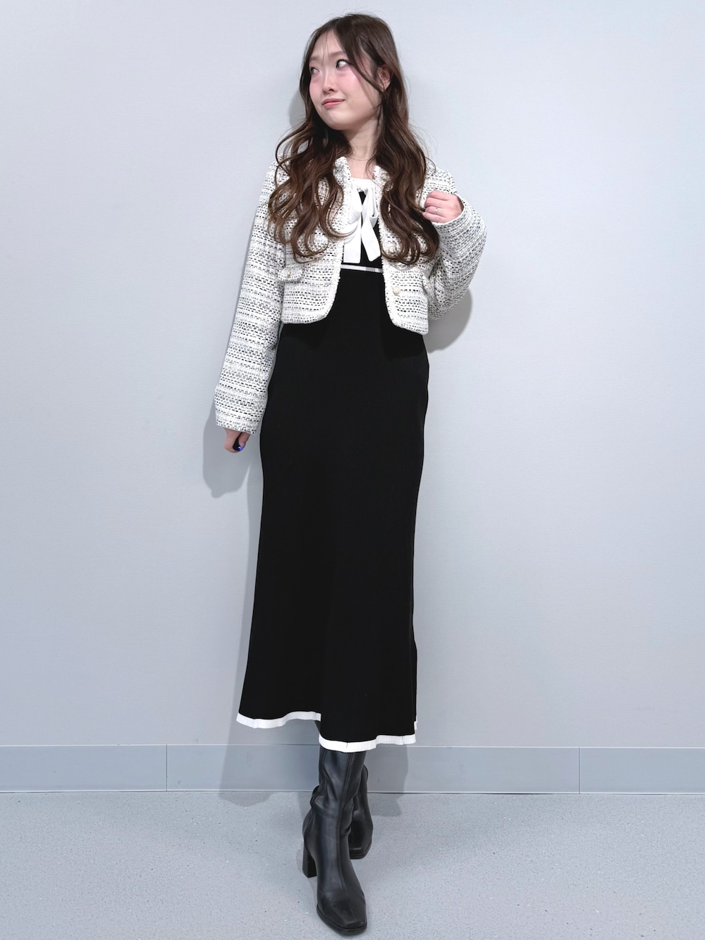 【アウター】 短丈のツイードジャケット🧥クロップド丈でバランスよく着用できます!165cmMサイズでウエスト位の丈感、掌が隠れるくらいの袖丈でした! 【ワンピース】 シンプルなリブニットワンピースは身体のラインが綺麗に見えるように腰の高い位置できゅっとくびれるシルエット👗配色デザインでシンプルながら華やかなワンピースです☺️165cmMサイズで足首上5cm程の丈感でした! 【シューズ】 秋口から大活躍のシンプルロングブーツ👢 脚にフィットするので、より脚をほっそり見せてくれます🫶ミニ丈に合わせるのはもちろんスリットの入ったアイテムに合わせるのもおすすめです!23.5cmで36サイズがぴったりでした☺️