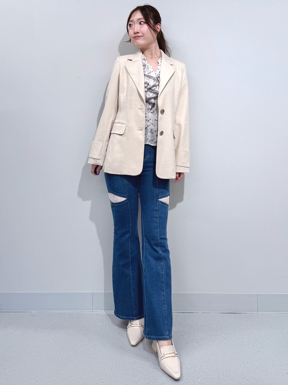 【アウター】 ウエストがきゅっとくびれて見える美シルエットのジャケット🧥セットアップはもちろんマーメイドシルエットやデニムスタイルとも相性抜群✨♡165cmMサイズでヒップが隠れる位の丈感です! 【ブラウス】 よく見るとチェリー柄になっているキャッチーなブラウス🍒胸元がV開きなのでフリルブラウスでもすっきりした印象で着用できます!同色のインナーがセットになっています☺️ 【デニム】 脚のラインをすっきり見せてくれるフレアシルエットデニム👖太ももの位置にレースのカットアウトが入るので脚長効果抜群です✨165cmMサイズで足首にかかるくらいの丈感でした 【シューズ】 春先に大活躍のミュールをローファーデザインに👡デニムにあわせてもワンピースに合わせても◎の万能アイテムです!23.5cmで36サイズがぴったりでした!
