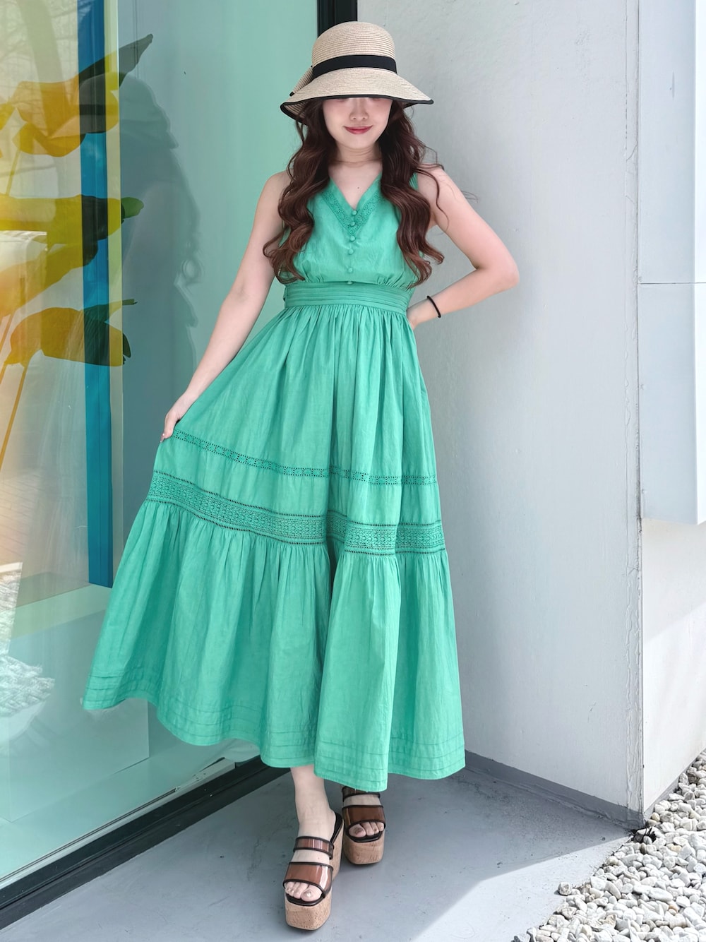 【ワンピース】 さらっとした着心地が夏にぴったりのコットンワンピース👗胸元のレースとバックシャン、腰のリボンデザインでカジュアルになりがちなコットンワンピースもきれいめな印象に...♡165cmMサイズで足首上3cm程の丈感でした! 【帽子】 シーズンムードを高めてくれる👒 つば広すぎず普段使いも◎ 【シューズ】 マーキュリーデュオ定番のウエッジサンダル🩰厚底ですが軽く履き心地も◎23.5cmで36サイズがぴったりです!