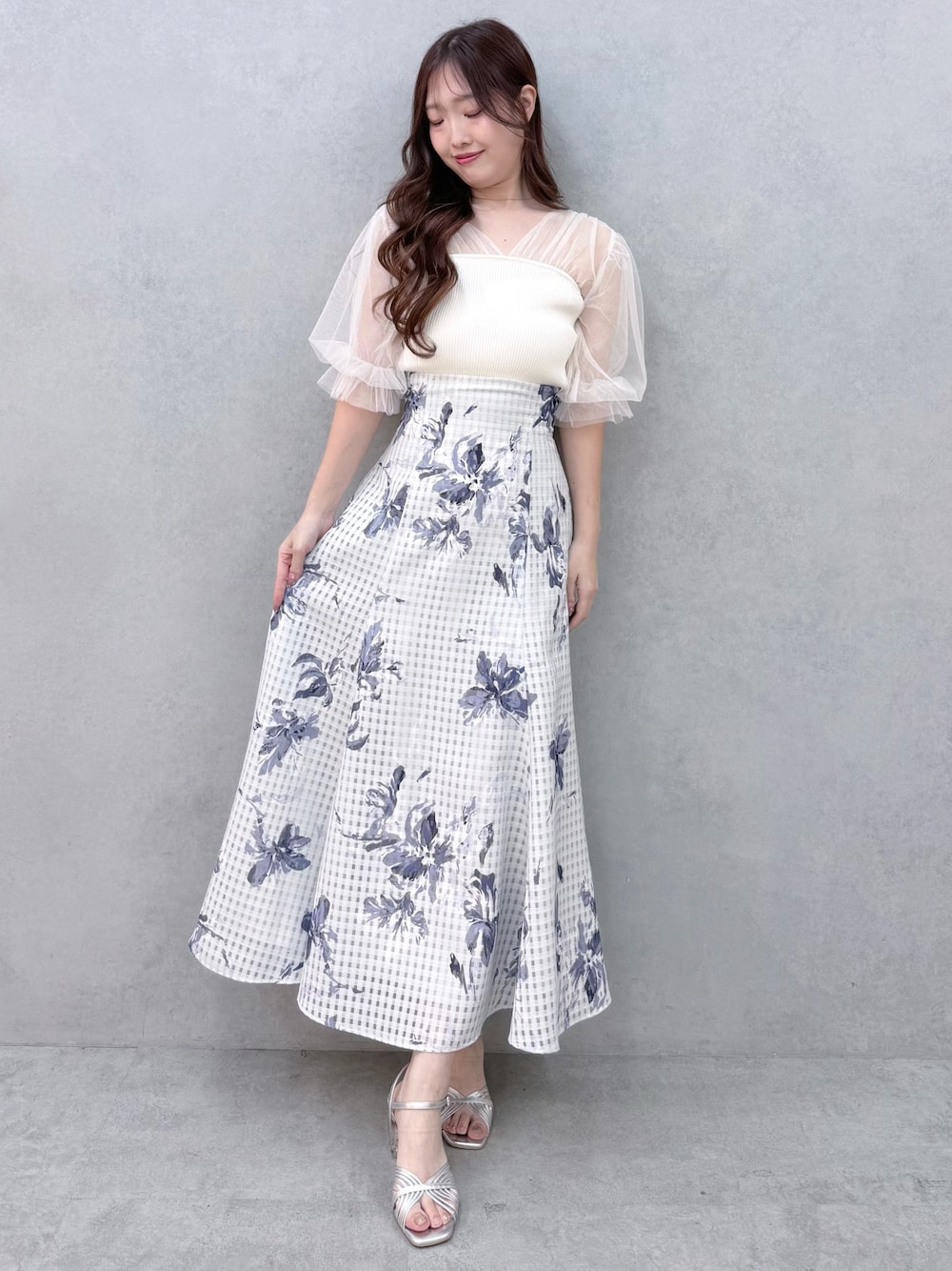 【トップス】 程よい透け感のチュールが華やかなニットトップス🧶身頃部分はフィット感があるのでチュールのボリューム感とのバランス◎ 【スカート】 ギンガムチェック×大柄フラワープリントで爽やかさと華やかさのあるスカート🫧バックレースアップでウエストのサイズは調整可能です✨165cmMサイズで足首が見えるくらいの丈感でした! 【シューズ】 きれいめなコーディネートと相性抜群のローヒールサンダル👡アンクルストラップ付きで安定感◎23.5cmで36サイズがぴったりでした!