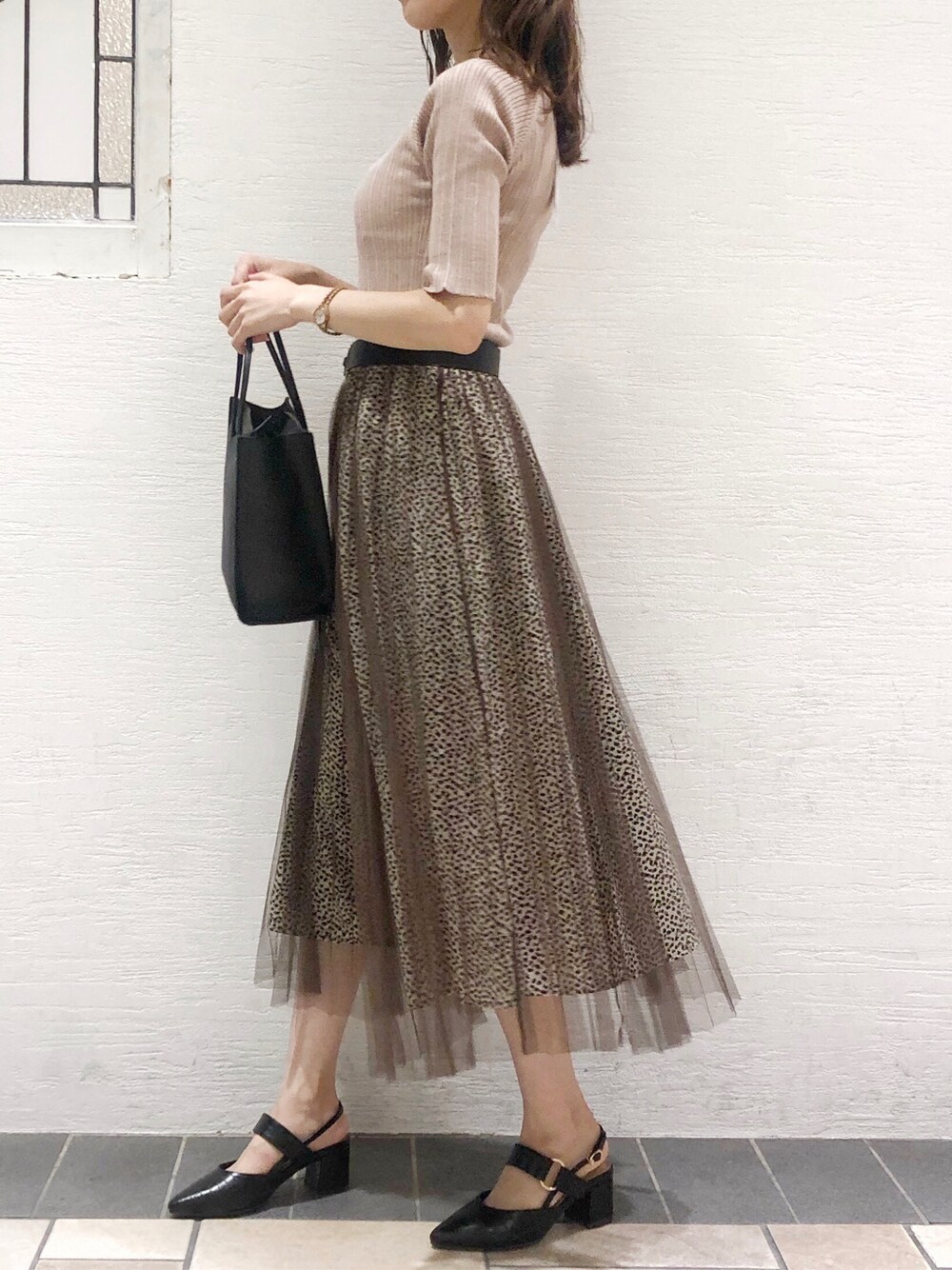 小物をブラックで統一すると一気に旬顔に♡スカートのチュールはとても柔らかく繊細なので、レオパード柄もエレガントにきまります❤︎