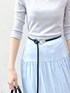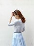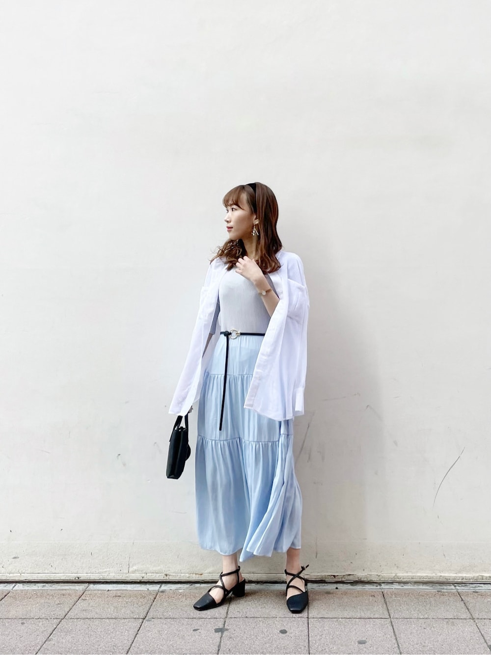 1枚でサラッと着れるコンビワンピース。トップス部分はリブでスッキリ、スカートはティアードシルエットでふわっと広がり、全体バランスがとても可愛いです♡ティアードは甘く見えるディテールなので、弱いシワ加工が施されていて甘さ軽減を◎シワ加工のおかげで、着てみると質感が軽くストレスフリーでした!♡トップスからスカートはグラデーションのような配色で、縦ラインが強調されてスタイルアップ出来るのもポイント。ウエストの切り替え部分にベルトを加えると、更に引き締まるのでオススメです♡合わせたシアーシャツは、コーデュロイなのにシアー感があり、つい触りたくなるような珍しい生地感です♪ベーシックなシアーシャツと違って透け感が抑えられているので、シーンを選ばず羽織れて重宝出来るアイテムです♡