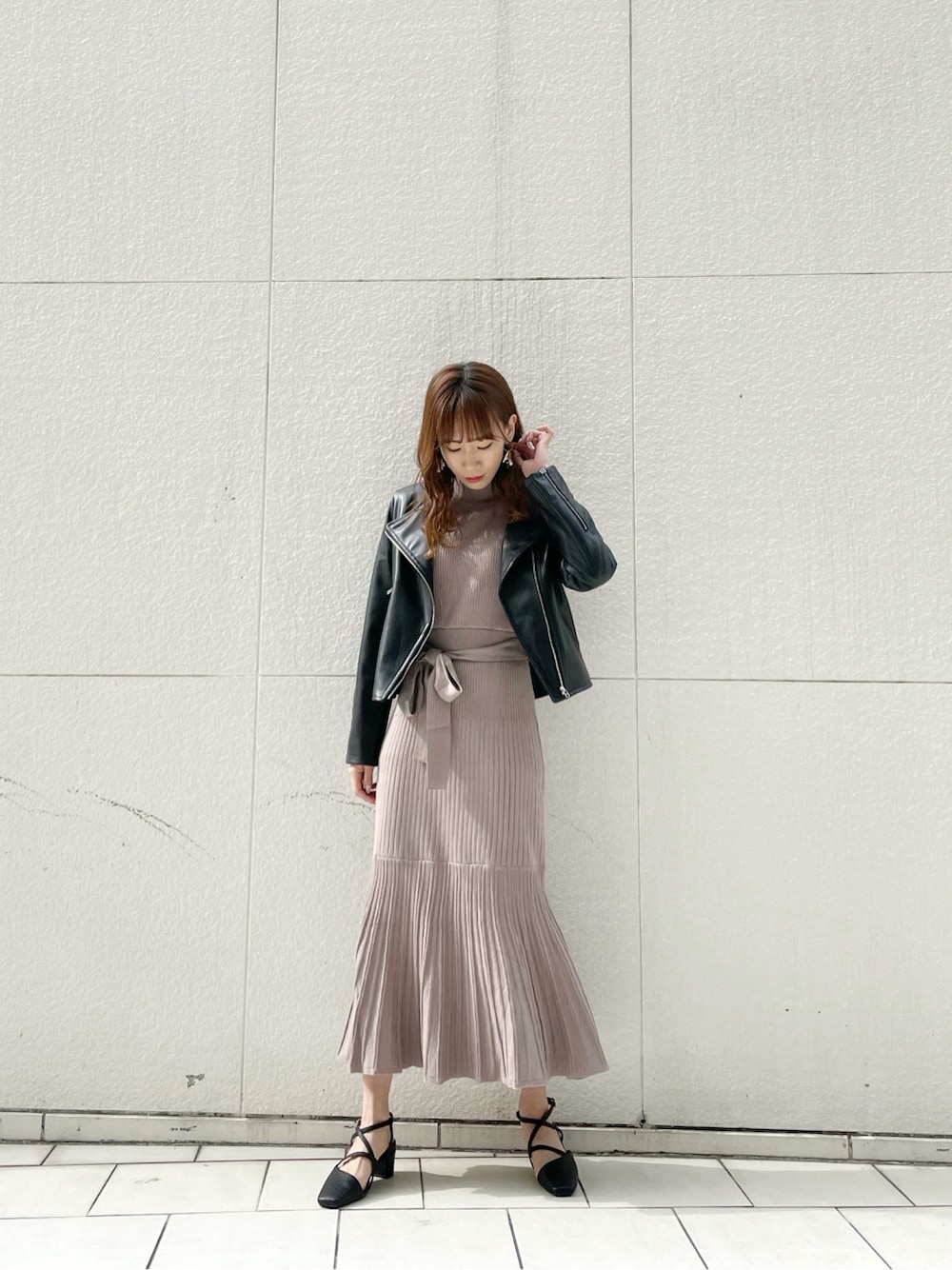マーメイドシルエット、シフォンスリーブ、ウエストリボン…と、乙女心くすぐるディテールの詰め合わせワンピース♡全体がリブなので、マーメイドシルエットがより一層綺麗に出てくれます◎スカートの中間でリブのデザインが切り替わっているので、すとんと落ちず立体感が出て、つい裾を揺らしたくなります♡お袖のシフォンは控えめな透け感で、近くで見ても二の腕が主張されません♪合わせたライダースジャケットは、dazzlinらしい滑らかな素材。ややコンパクトサイズでベーシックデザインなのでどんなコーデとも相性抜群です◎なにより柔らかいので、腕が全力で上げられるくらいストレスフリーな着心地です♡