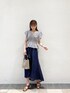 フロントは深めのVネック×シャーリングで女性らしさたっぷり、振り返ると背中見せで360度可愛いが叶うブラウスです。シャーリングが全体ではなく部分的に施されているので、バスト周りが強調されず着用出来て、こちらが個人的に好きだなと思ったポイントでした♡肩のフリルも落ち感があるので張らず、子供っぽくなりません◎合わせたスカートは、前後で丈が変わっていてデニムなのに歩くと揺れるので、合わせやすいのに気分を上げてくれるアイテムです。ステッチを入れることでいつものデニムコーデをぐっとお洒落に格上げしてくれるので、1枚持っているとヘビロテ間違いなしです♡少しカジュアルなコーデなので、バッグは型押しをチョイスして大人っぽさをプラスしてみました♡