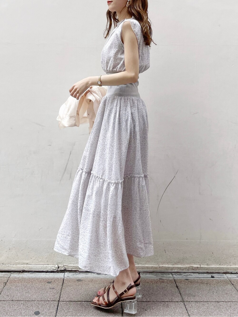 「ウエストが無くなるワンピース」と、スタッフのなかで話題になった驚きの着痩せ力。実はdazzlinオリジナルの花柄を使っていて、どこを探しても見つからない、かぶることのないデザインです♡ウエストの切り替えはカットソーなので暑さを感じにくく、ぎゅっと上げるとウエスト細見えに加えてバストアップ効果もありました♡肩はフリルでフレンチスリーブになっていて二の腕もカバー。女性に嬉しいポイントの詰め合わせですね♪合わせたアウターは、形は定番のGジャンですが、シアー素材でしっかり今っぽさをプラス。シャツを羽織っているのかな?ぐらいの軽量感で、普段のバッグに忍ばせていると真夏の冷房対策にも重宝しそうな予感です♡