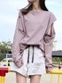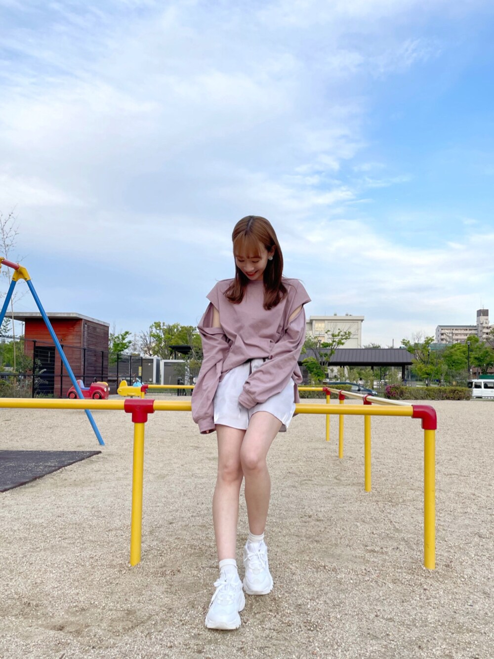 先日の休日コーデ。この日は晴れていたので、公園でリフレッシュを。しっかり可愛さもあって動きやすい、こちらをイメージして合わせてみました♡【トップス】ロンTと聞くと、私はどうしてもカジュアルすぎるイメージがあって、今まであまり選ばなかったのですが、アームの大きく開かずちらっと覗く素肌があざと可愛くて…。リアルバイしてとても重宝しています♡160cmでお尻にかかる丈なので体型カバーもしてくれますよ◎ 【ショートパンツ】生地に艶感があり、付属のリボンもレザー仕様と、大人女子でも着られるショートパンツ。自然なAラインシルエットで、脚もしっかり盛れます!仕上げの厚底スニーカーは、あえて真っ白を選び、元気なコーデなので配色を綺麗めなトーンでまとめました♡