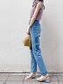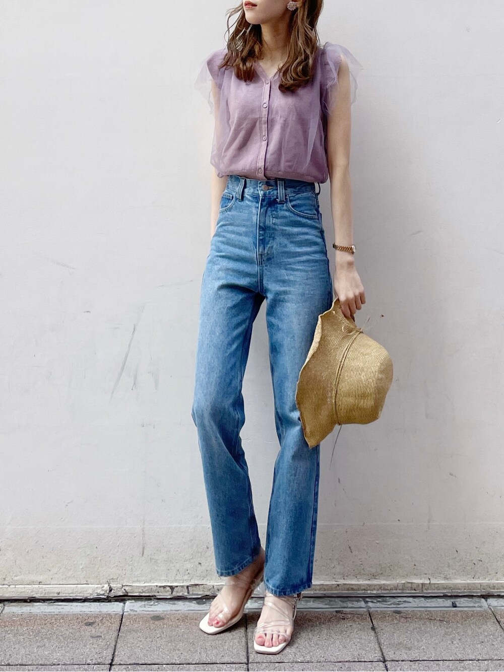 フェミニン、スウィート派のデニムコーデ。カジュアルな印象のストレートデニムも、チュールトップスを合わせることで女性らしさをプラス♡【トップス】繊細なチュールでチクチク感が無く、肌触りがとても滑らかで感動しました!まるでベールを纏ったようなディテールで、サイドから見ると身頃がふわっとして見えるのも乙女心をくすぐります♡Vネックで大人っぽく見えるので、甘めデザインも挑戦しやすいです♪【デニム】履いた瞬間思わず「え?」と言ってしまった美シルエット。dazzlinらしい細身のストレートデニムで、ハイウエスト効果も抜群です!ウエストは最小のSサイズで58cmと、デニムのサイズで悩まれることが多い小柄な方にも是非試して頂きたいサイズ感です!!サイズ展開はS〜Lサイズまでございます!【シューズ】dazzlinで昨年も人気があったサンダル。クリアヒールなのに軽くて歩きやすいので長時間歩くときにも履けちゃいます◎4色展開でどれも可愛いですが、今回はチュールの透明感に合わせてクリアを選びました♡