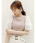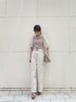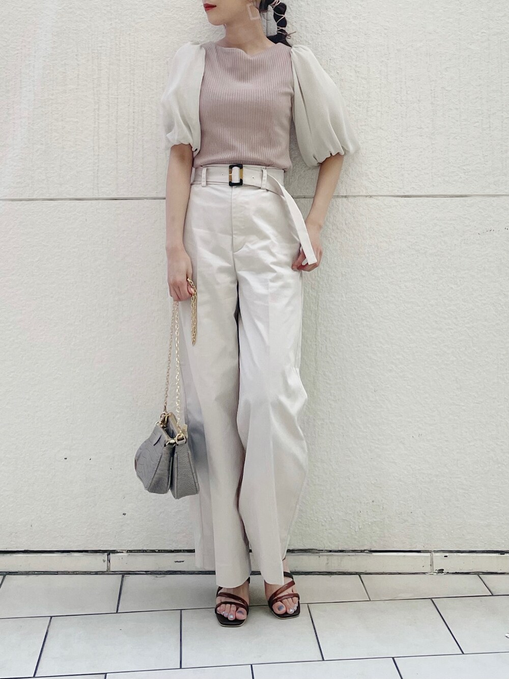 パンツをフェミニン、綺麗めに着たい!そんなときにオススメなコーディネートです。【トップス】大きめなパフスリーブで二の腕を完全カバーしてくれます。ややシアー感があるので、ボリュームが出過ぎて見えないようになっています!身頃はカットソーのリブなので、夏場でも着用可能です♡着てみると、首元は開きすぎず詰まりすぎずの絶妙なラインで、今回パンツで合わせましたがジャンスカのインナーで着ても可愛いなと思いました♡【パンツ】普段パンツを購入するときの悩みで、ウエストが大きい、ベルトの穴が足りない、丈が長すぎる、このような悩みを抱えている方も多いかと思います。dazzlinのこちらのパンツはベルトの穴を最小にするとかなり小さくなります!私も穴が足りなくなることなく綺麗に履けたので即買いしました♡長さは低身長さんはSサイズ、高身長さんはMサイズとサイズ展開もあるのでぴったりサイズを履いていただけるかと思います◎【シューズ】私のスタッフコーデにも度々出てきているクリアサンダル。どのコーデにもこのサンダルを合わせたくなるくらい本当に履きやすくて軽いです!今回はモカのトップスに合わせてブラウンを選びました♪ブラウンのみ、クリアと合皮の2素材が使われているので、高級感を出したいときやクリアサンダルを綺麗めに合わせたいときにオススメです♡