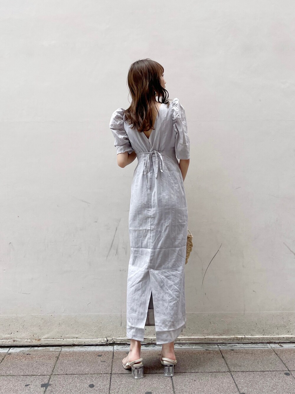【ワンピース】綿100%のコットンワンピースは夏になると1枚は欲しいアイテムですよね♡ウエストにギャザーが入ることでスッキリ見せてくれます◎更に、パワショルになっていたりと可愛らしいディテールが詰まっているので、あえてIラインシルエットで大人っぽさとのバランスをとって頂けるようになっています♪なによりポイントはバックスタイル。背中がざっくりと大胆に開いていて、振り返るとフロントの甘さから180度変わって大人の女性らしさをアピール出来ます。◎なので、デートにも良いですね♡【雑貨】夏らしいコットン素材のワンピースを活かしたかったので足元はクリア、バッグは雑材を選びました!コットン、クリア、雑材、こちらは夏に向けてとても相性が良く映えるので、是非合わせてみてください♡