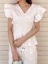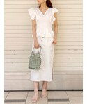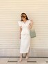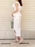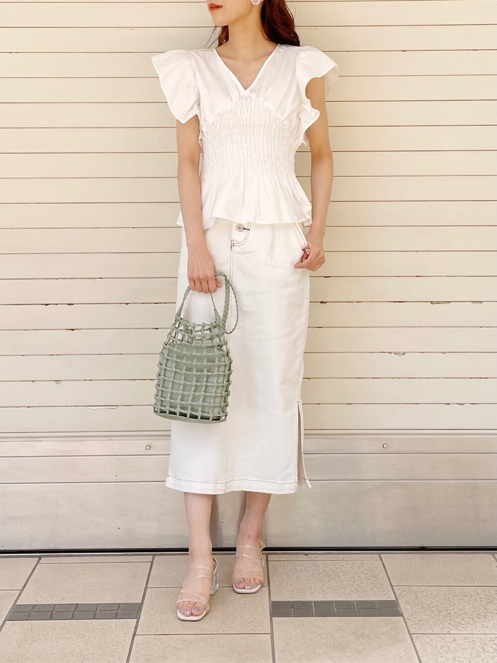 涼しげなオールホワイトコーデ。差し色も淡いグリーンで全体的に品のあるスタイリングにまとめました。【トップス】私が着ているオフホワイトとブラックは綿100%で、ハリのある素材です。着ると肩のフリルが立体的になってくれて、小顔効果を感じられました♡その他のカラーは柔らかく、フリルは落ち感のあるナチュラルな印象です♡以前にミックスの着用コーデも載せているので是非比較してみてください◎ また、なんと言ってもポイントはバックスタイル。フェミニンな形なので、背中開きで大人の女性らしさをアピールできます♡【スカート】タイトですが、サイドのスリットで動きやすいです◎普段、自転車などに乗る方でも苦痛なく履けるようになっているので、デイリーに着回していただけます♪今回トップスはアウトで着ましたが、コンパクトトップスをインで着てもフロントボタンがしっかりとアクセントになってくれるのでベルトなど小物を考えなくても大丈夫です!【サンダル】オールホワイトコーデの透明感を更にUPする為に足元はクリアをチョイス。私も愛用しているのですが、長く履いているとクリアチューブが少しずつ伸びて馴染んできたので、サイズはぴったりで良いかと思います◎私は普段22.5〜23.0cmでSサイズでちょうど良いサイズ感でした♡【バッグ】大きめの編み目がコーデのオシャレ度をぐっと格上げしてくれます☆バッグ自体が軽いので、ストレスフリーで持てますよ♡