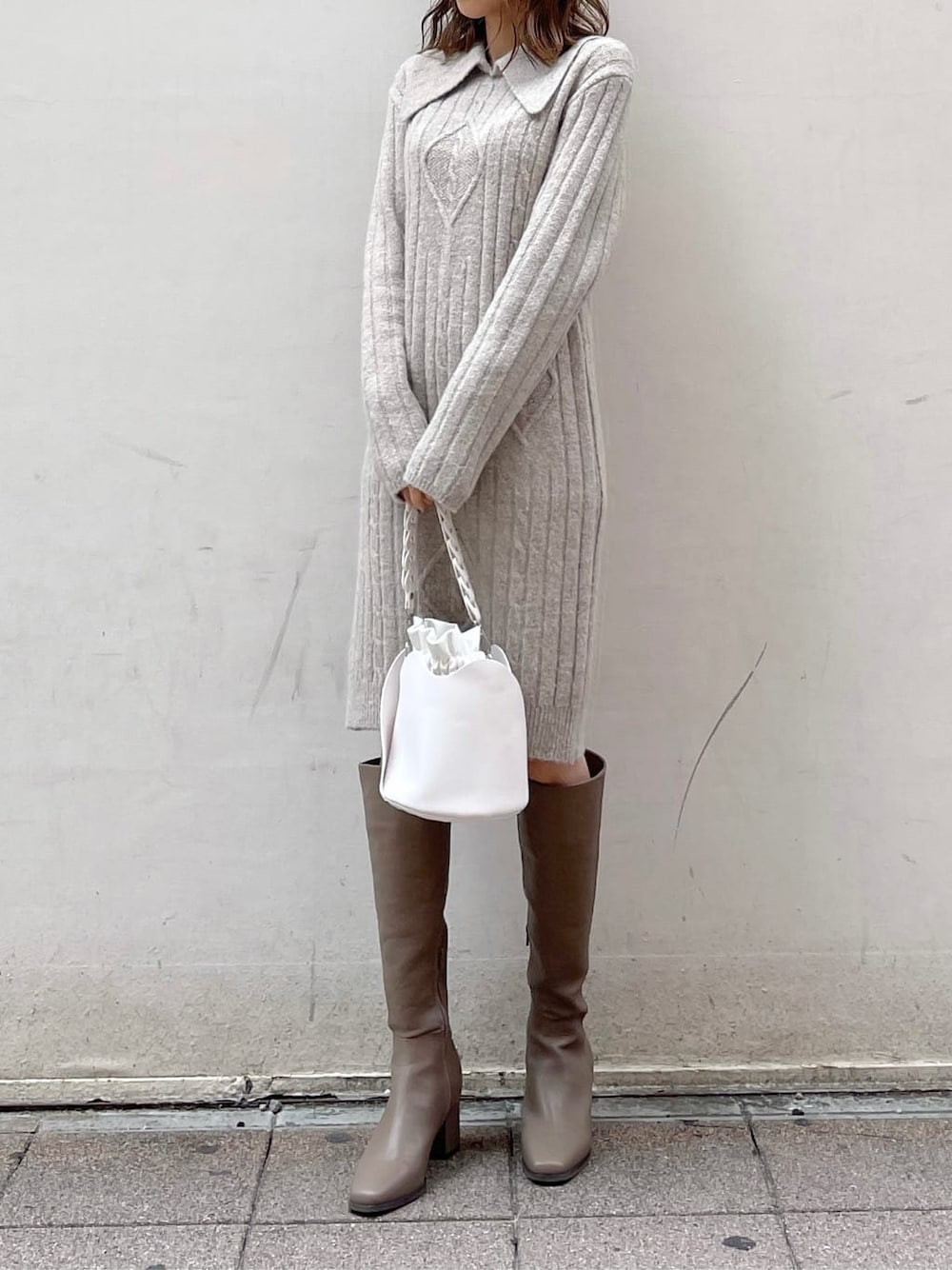\大人女子が着られるミニワンピース/店頭でもお問い合わせを度々いただくニットワンピース。160cmの私が着ても短くなりすぎない、高身長さんにも優しいミニ丈です◎ロングブーツと合わすと隙間から少し覗く素肌があざと可愛くて、こういうスタイリングでデートに行きたいな〜なんて想像をしてしまいます♡着てみると、シルエットはいつものニットワンピースよりややタイトに感じました!タイトではありますが生地が厚めでしっかりしているので、ショーツラインもあまり気になりませんでした!◎なのでデイリーに活用できるのも嬉しいポイントです!全体的に大人見せなディテールが詰まっていますが、襟元はセーラーカラーでトレンドと可愛さも忘れずに入っているのがdazzlinらしいところです❤︎