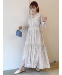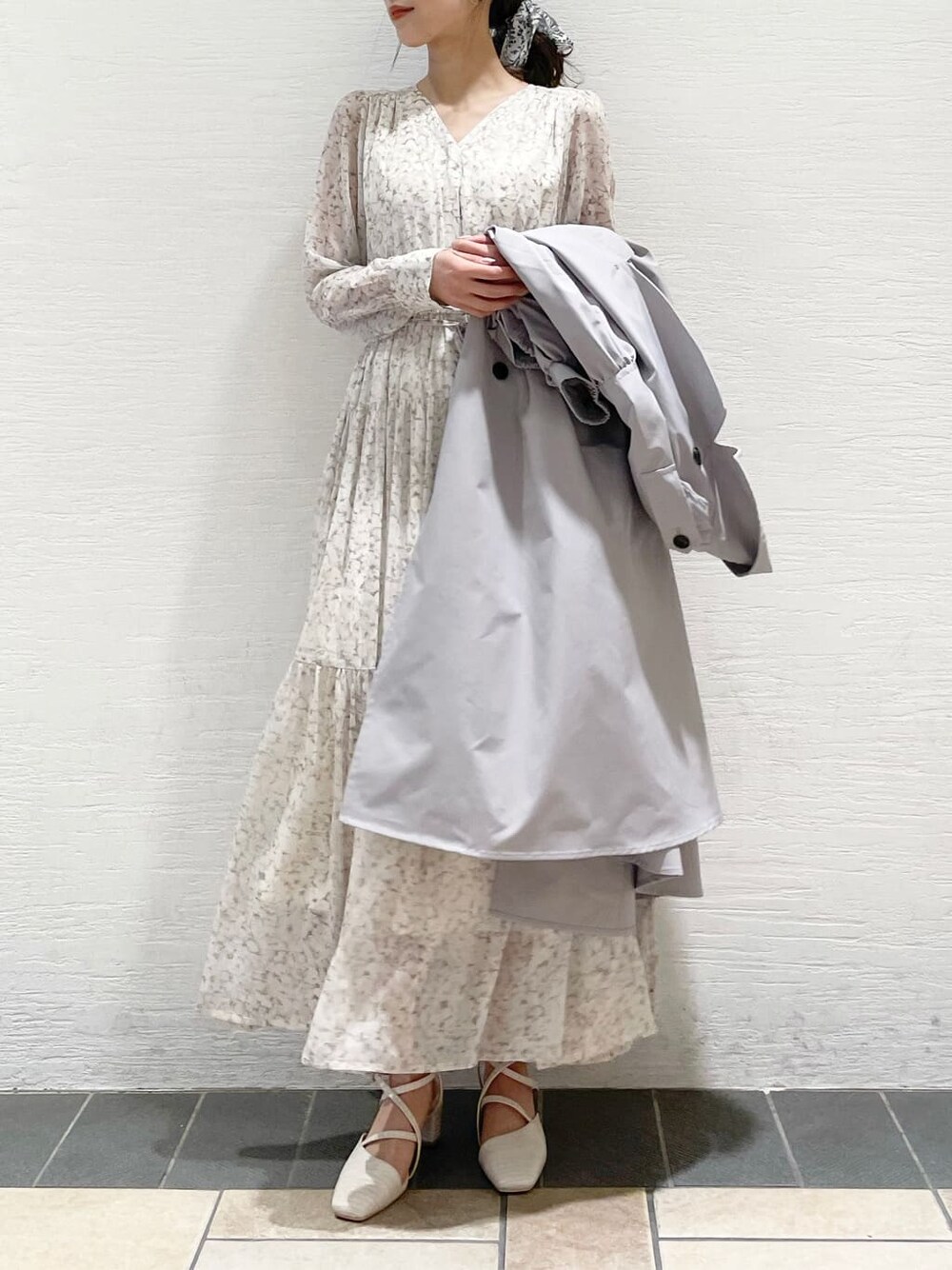 春らしさ満点。大好きな大人フェミニンコーデを組んでみました♡【ワンピース】dazzlinオリジナルの花柄で、他では手に入らないワンピース。私も絶対に欲しくて入荷を心待ちにしている最中です…♡着てみると軽やかで動きが出て、お花見など外にお出かけしたくなるワンピースでした◯たっぷりティアードで可愛さがぎゅっと詰まっていますが、シフォン素材なので広がりすぎることなく大人っぽく着ていただけます◎袖のみ少し透け感がございます♪私は今までオレンジのお洋服はあまり着てこなかったのですが、アイボリー系の柔らかいオレンジで、カラー物初挑戦の方にもオススメです♪【トレンチコート】リアルバイしたアイテムです◯今までに持っていたトレンチコートとは一味違ったデザインで、着るだけでお洒落感漂う1枚です。張りのある素材でシワになりにくく、オンオフ共に大活躍の予感です…♡袖にボリュームが来るのでかっちりせず、女の子らしさが出るトレンチコートになっています◎以前、同じトレンチコートのベージュを前を閉めて着たスタイリングをUPしたのですが、今回は前を開けて着てみました!是非、ベージュの方もチェックしてみてください♪ちなみに、ヘアアレンジは別のトップスに付属になっているスカーフを使ってみました♡