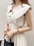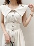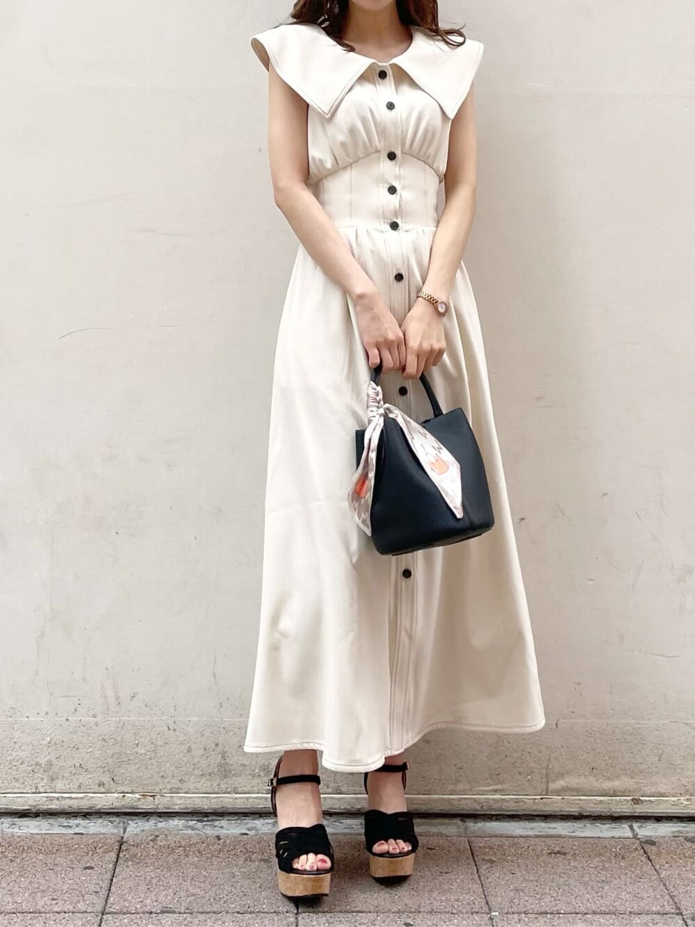 まだまだトレンドの大きな襟がポイントの【ワンピース】。小顔効果があり、更に後ろのレースアップをきつく結ぶと好きなサイズ感まで締めることが出来るので、スタイルアップが叶います◯。私はウエストのサイズ感で困ることが多いのですが、きゅっと結ぶとジャストサイズに調節することが出来ました!ノースリーブを着るとどうしても脇辺りの空洞が気になりますが、こちらのワンピースは脇が見えないようになっているので、ノースリーブに懸念点のある方でも挑戦しやすくなっています♪【サンダル】dazzlin定番のコルクヒールサンダル。ヒールの高さの割に軽くて脚にフィットするので、ライブ用に買われるお客様も多いです♡私は普段22.5〜23.0cmを履いていて、こちらのサンダルはSサイズでピッタリでした◎