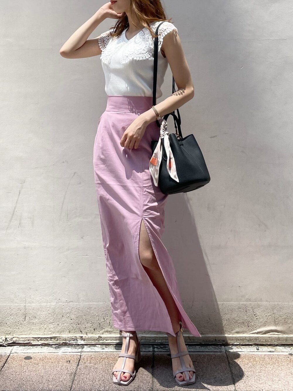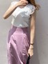 \\ホワイト×ピンクの甘め配色は、大胆な肌見せでバランス良く◎//【トップス】スッキリ見えるリブニットはボディラインを出しつつ、大きな襟で小顔効果も◯ノースリーブに苦手意識のある方でも、肩の張る部分を襟が隠してくれるので安心感がございます♪【スカート】リネンライクな涼しい素材で一見カジュアルですが、スリットが入っていて女っぽさをアピール出来ます!ウエストのサイズは、Sサイズでピッタリ履けました❤︎【シューズ】私は普段22.5〜23.0cmを着用するのですが、こちらのサンダルはSサイズでややゆったりした余裕のあるサイズ感でした!軽くて長時間歩く日にもオススメです♡