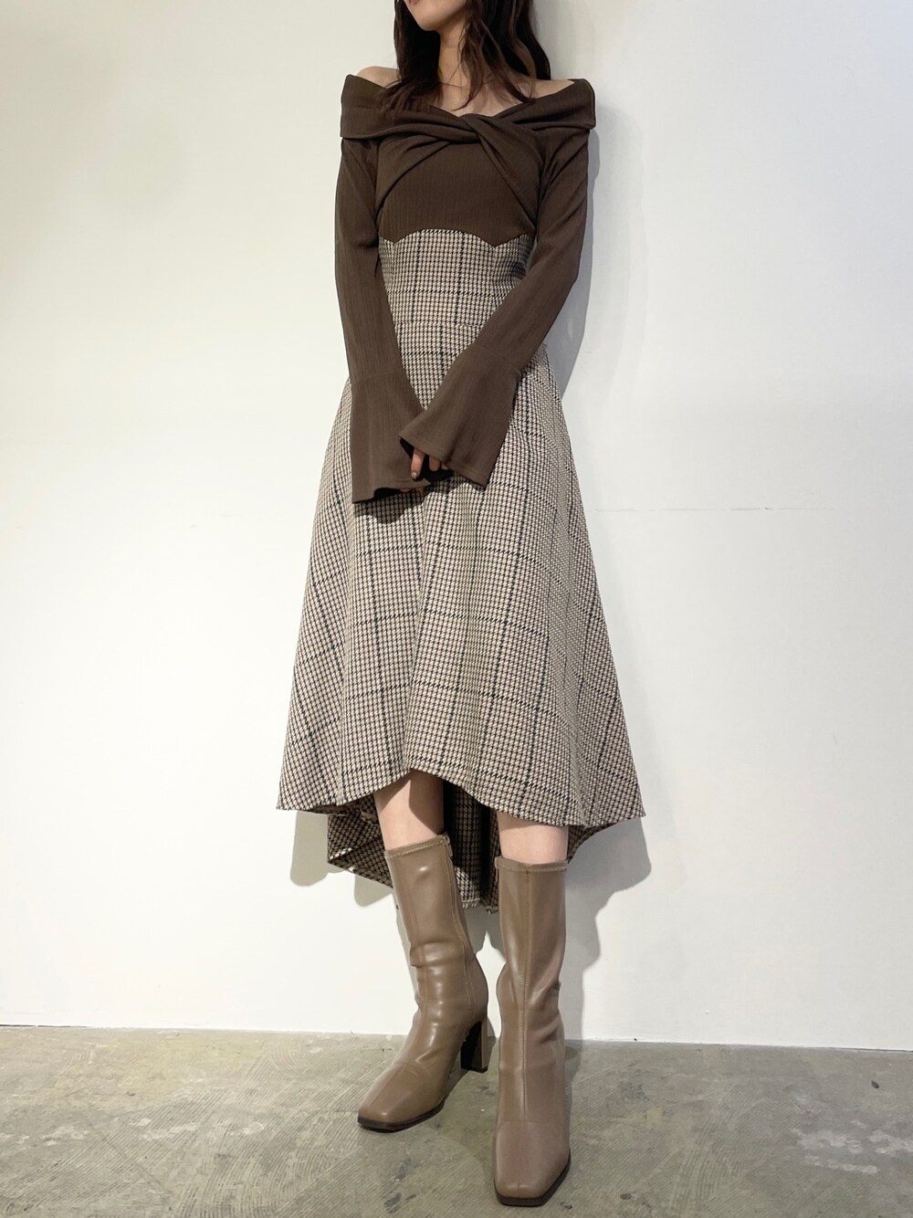 10/28、dazzlin店舗で待望の再入荷、、♡♡ 《ワンピース》 dazzlinの-5kgシリーズは本当に着痩せします↑ 今回はオフショルでも着ていただけます。 前後の裾がアシンメトリーになっているので、 歩くだけでふわっと揺れるシルエットもとても可愛いです♡ デコルテが盛れるのも嬉しいポイント。 《ブーツ》 22.5〜23.0cm、足幅狭め、厚み薄めでMサイズ着用です。