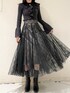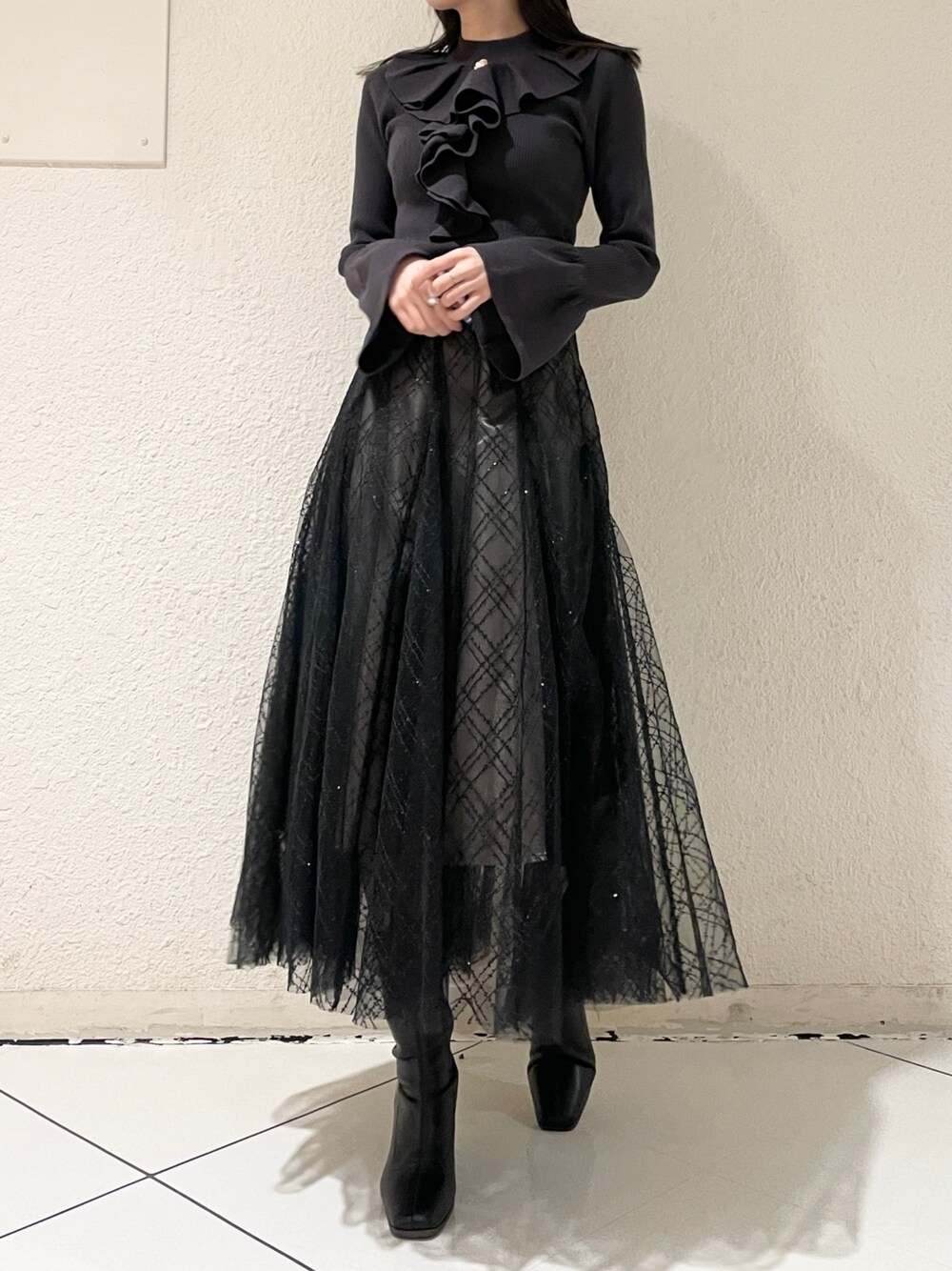 モノトーンで甘さ控えめ。 冬のフェミニンコーデ♡ 《ニット》 柔らかいリブニットで着心地がとても良かったです。 フロントのデザインでフレンチガーリーな印象もありつつ 大人っぽいカラーリングで絶妙なバランスを楽しめます◯ 《スカート》 ラメではなく、スパンコールが施されているので 光の当たり方で輝き方が変わります。 裏地が少し短くなっているので 160cm、Sサイズ着用でブーツを履いてちょうど良い丈感でした♡ 《ブーツ》 22.5〜23.0cm、足幅狭め、厚み薄めでMサイズ着用です。