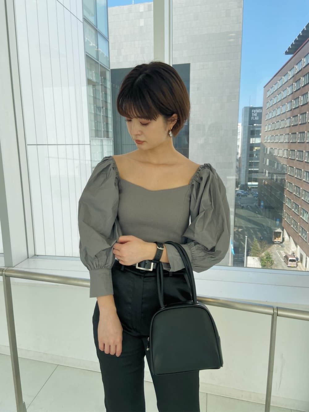 お洒落な抜け感を漂わすアンニュイカラーとサテンパンツのグロス感が目を引く、トレンドが詰まった綺麗めコーデ♡デートや女子会の雰囲気にも◎袖のボリュームがボディーのフィット感がウエストをくびれて見せてくれるので細見え効果も抜群!ボディー部分は伸縮性が効いておりほどよいフィット感がクセになります!サテンパンツは柔らかい生地感が履きやすくなっています♡小物はブラックでまとめ足元はスクエアミュールで楽ちんだけど女性らしさをプラス!