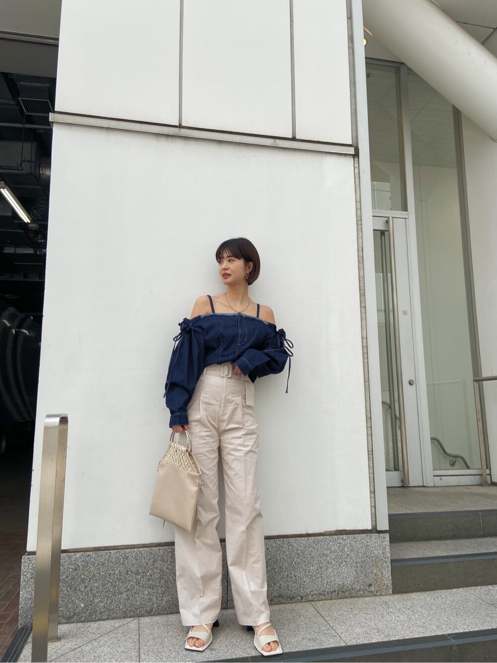 デニム素材をホワイトの小物やパンツでまとめ爽やかな春コーデに!色味のバランスが季節を感じさせてくれるおすすめスタイルです♡袖のゆったりとしたボリューム感は二の腕をカバーしてくれる為、華奢な印象に!合わせのボトムスはウエストの位置が高く脚長効果も抜群です!