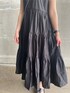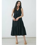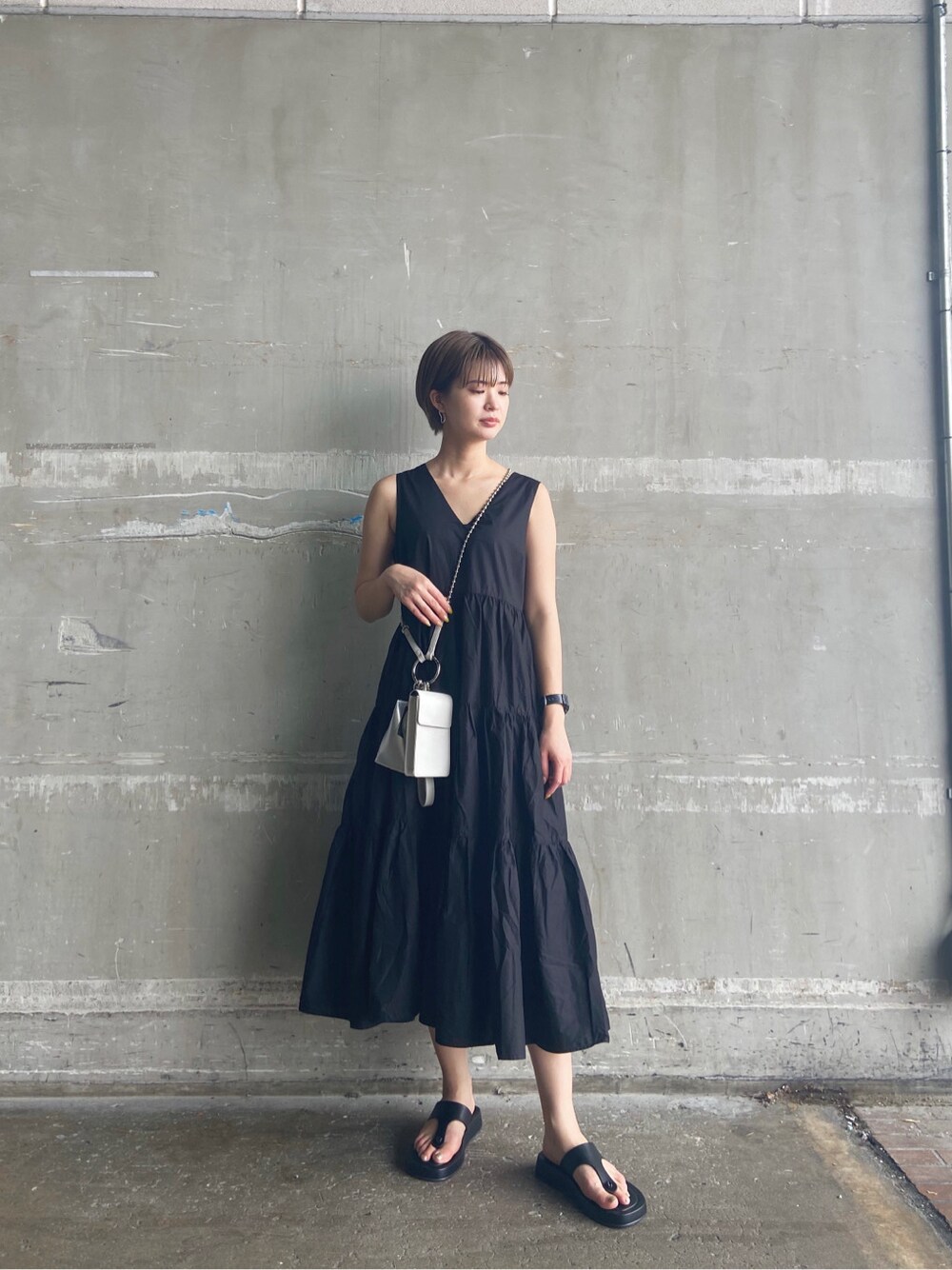 【夏のブラックでまとめるヘルシーコーデ】可愛いらしい印象のティアードワンピースはブラックを選ぶことで甘すぎない大人な雰囲気に♡首元のVネックは空きすぎておらずインナーも気にせず着用して頂けるので1枚で楽ちん!!トレンドのティアードワンピースは裾の広がりが上半身を華奢に見せてくれる為、肩幅や二の腕周りの細見え効果も抜群◎足元はフラットなサンダルで抜け感をプラスして、ホワイトのバッグを選ぶことで涼しげな印象にしております。164センチの私が着用するとマキシ丈にはなりませんが、足首がスッキリ見える為華奢に見せてくれます。